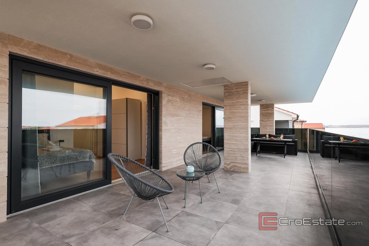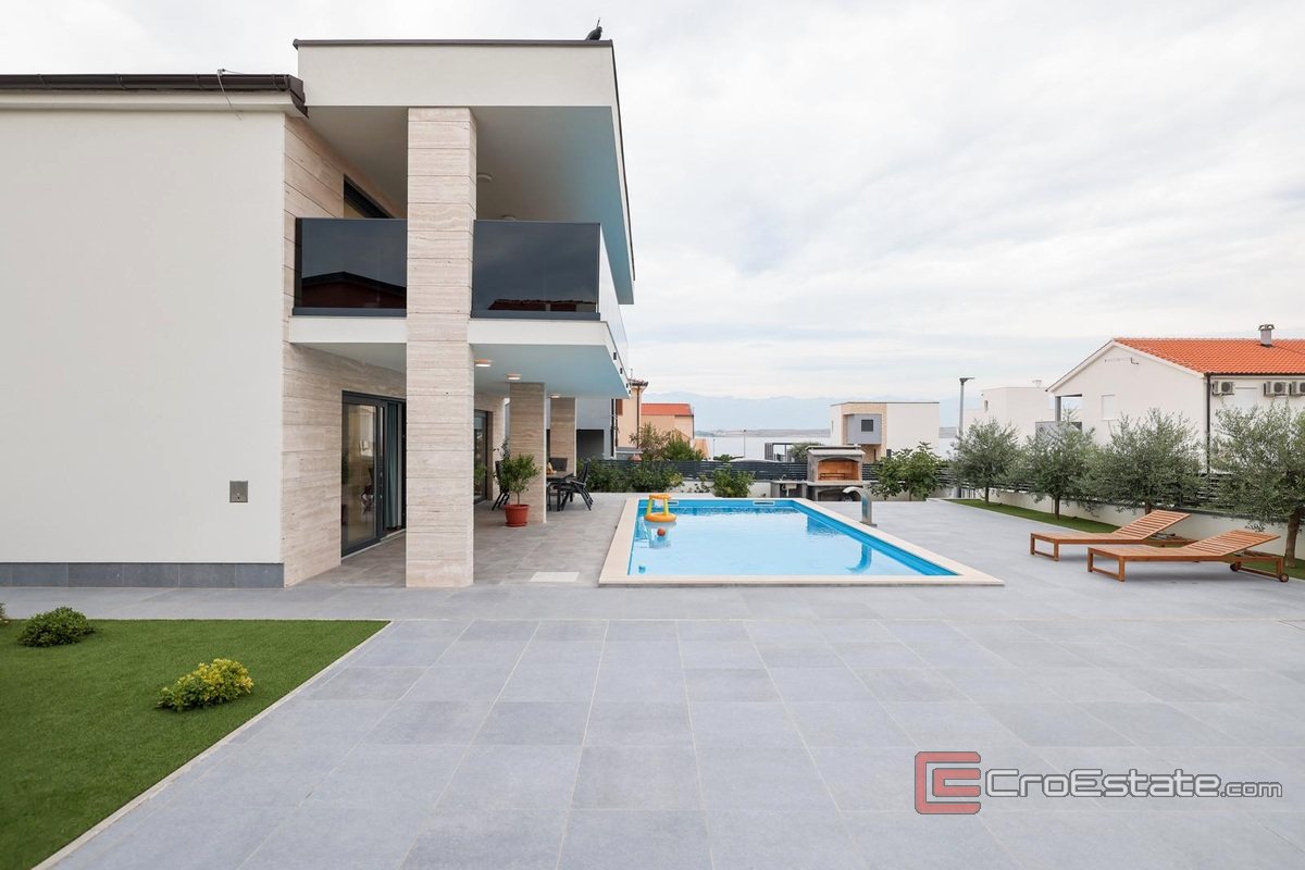 Une nouvelle maison individuelle au design moderne dans une baie de l'île de Vir. La maison d'une surface habitable totale de 220 m2 est située sur un terrain de 533 m2 dans un endroit plus petit, ce qui procure donc la tranquillité.