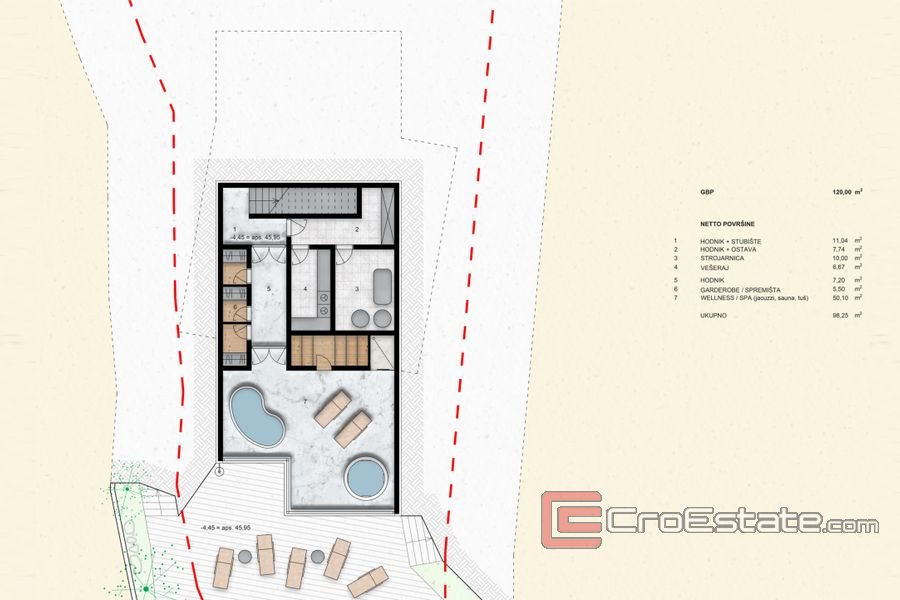 La villa est conçue avec une finition haut de gamme et construite avec des matériaux de première qualité. La propriété se compose d'un sous-sol, d'un rez-de-chaussée et d'un premier étage. Au sous-sol se trouvent une buanderie, une salle des machines, un débarras, une penderie et des espaces bien-être et spa équipés d'un sauna, d'un jacuzzi et d'une douche.