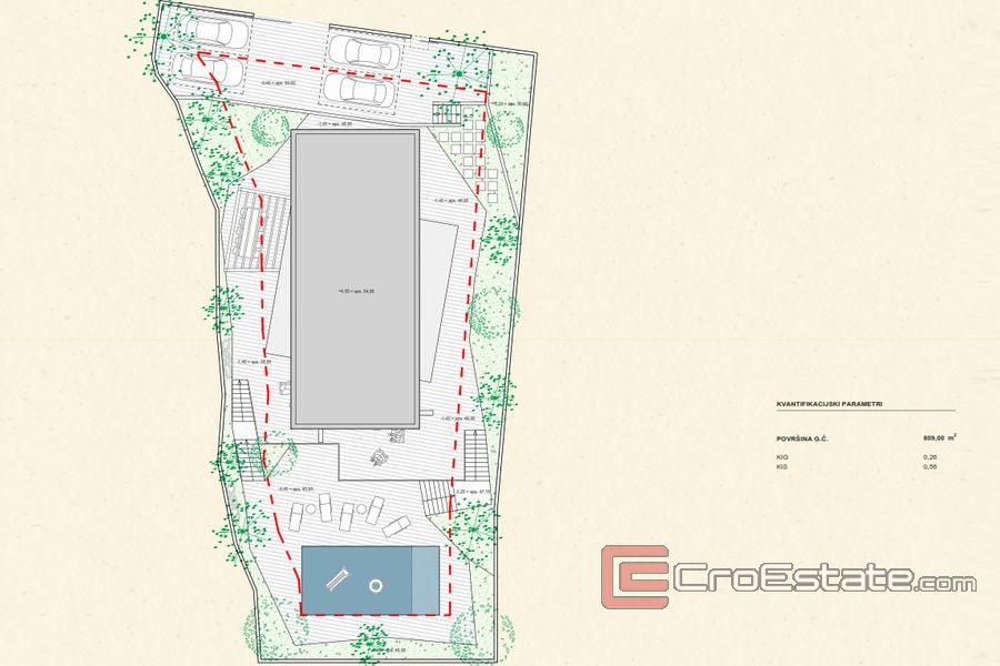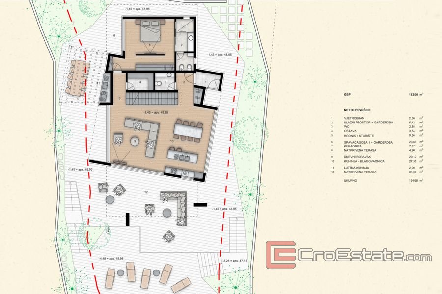 La villa a une surface habitable totale de 391 mètres carrés et est située sur un terrain spacieux de 740 mètres carrés avec de superbes vues panoramiques sur la mer. La propriété est située dans une communauté fermée composée de trois villas, où chaque villa a une entrée et un garage séparés.