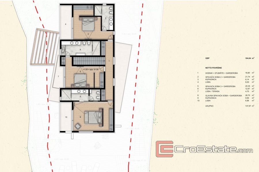 Le premier étage se compose de trois chambres, chacune avec sa propre salle de bain, dressing et sortie sur la loggia ou la terrasse. La villa est entièrement équipée de systèmes intelligents qui assurent un maximum de confort et de praticité. Le système de chauffage et de refroidissement est assuré par la climatisation et le chauffage au sol. La propriété est livrée avec quatre places de parking dans un garage privé, séparé des deux autres villas.