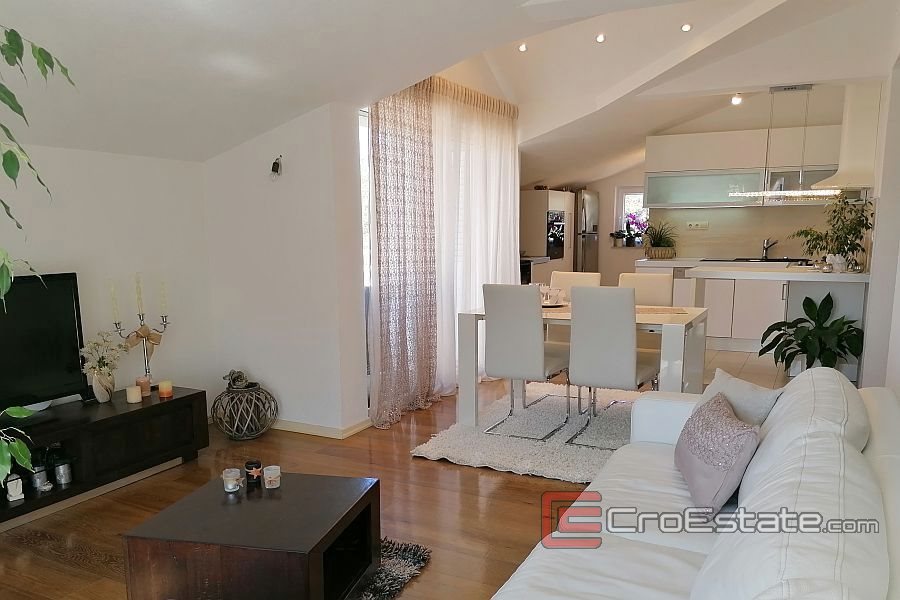 Al piano mansardato si trova un appartamento di 132 m2 in cui si trova un soggiorno, cucina con zona pranzo, due camere, due bagni, antibagno, terrazzo. Un bagno non è ammobiliato.
