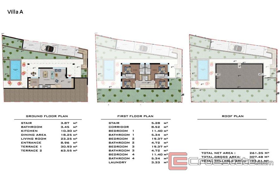 La villa sarà orientata a nord e avrà una superficie abitabile di 261 m². Al piano terra dell'edificio ci sarà una zona giorno open concept, un disimpegno e un bagno. La scala interna porterà al primo piano, dove ci sarà una lavanderia e un corridoio che conduce a quattro camere da letto con i propri bagni.
