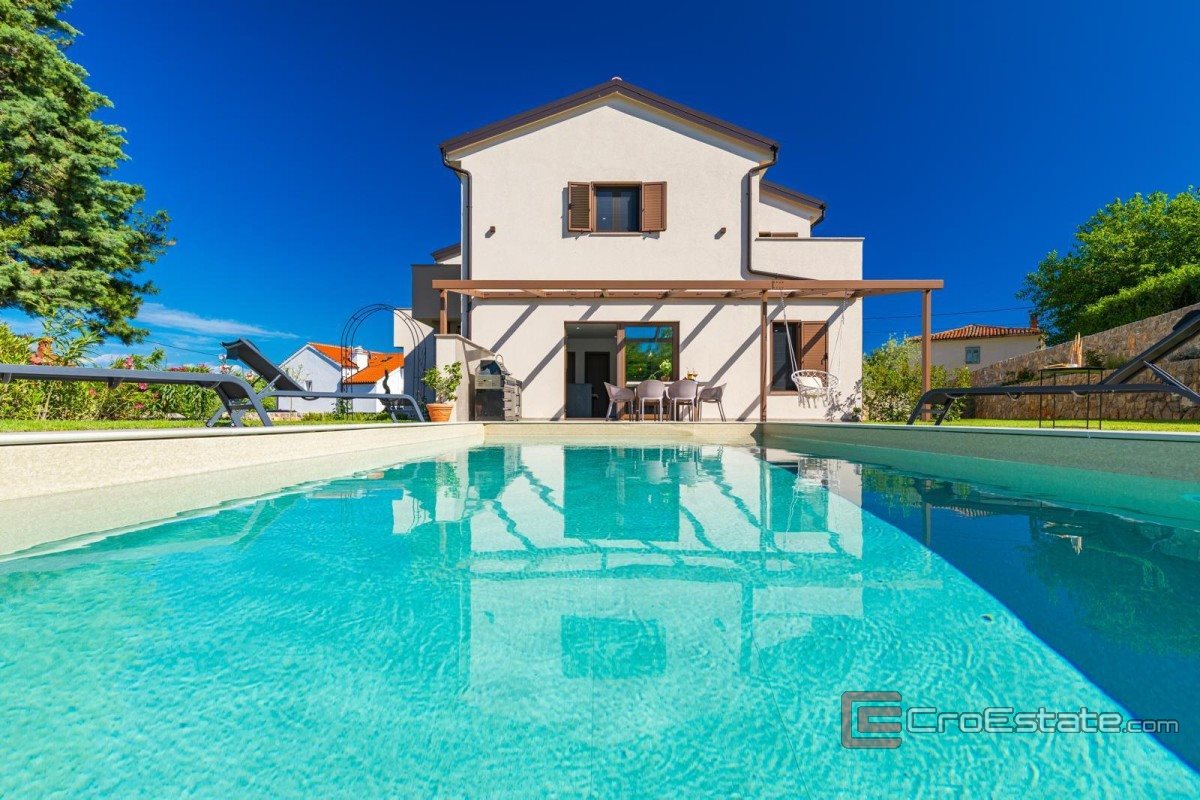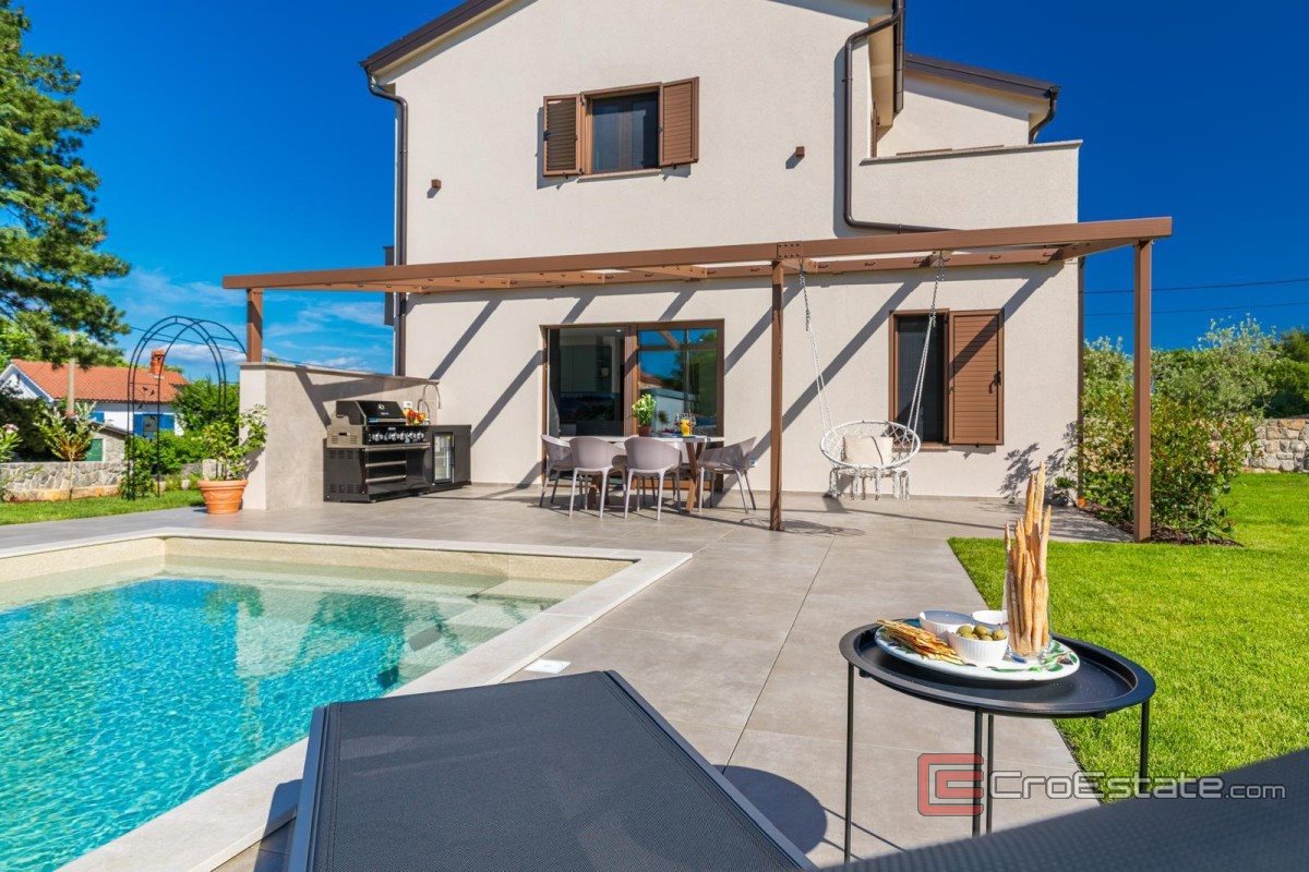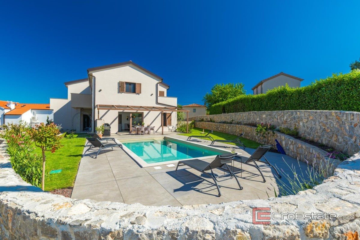 In una posizione tranquilla vicino alla città di Krk, è in vendita una moderna casa bifamiliare di 140 m². Il piano terra è composto da ingresso, ripostiglio, bagno di servizio, camera da letto con bagno e soggiorno collegato alla cucina e alla sala da pranzo, con accesso a una terrazza coperta e al giardino. Al piano superiore si trovano due camere da letto con bagno privato e accesso a un'ampia terrazza. Il giardino comprende una piscina con solarium, una cucina esterna con barbecue e un'area comune. È presente un impianto di irrigazione automatico. La casa viene venduta arredata e le dotazioni includono riscaldamento a pavimento, aria condizionata multisplit, infissi in PVC e alluminio a tre strati, porte blindate, pavimenti in ceramica e legno e sanitari di qualità. Sono disponibili due posti auto. La distanza dal mare e dai servizi è di circa 3 km.