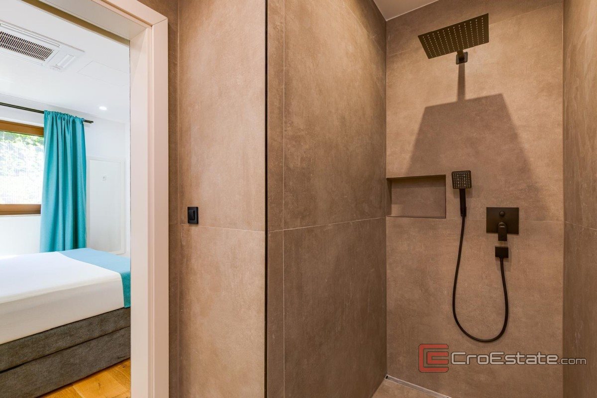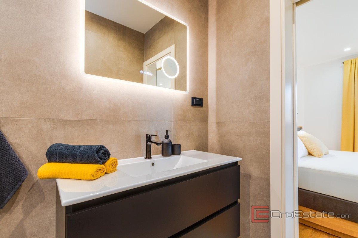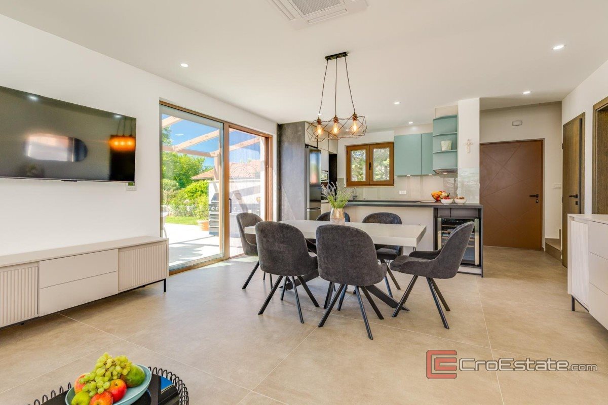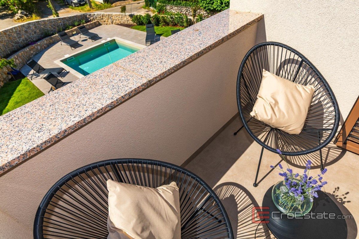 In una posizione tranquilla vicino alla città di Krk, è in vendita una moderna casa bifamiliare di 140 m². Il piano terra è composto da ingresso, ripostiglio, bagno di servizio, camera da letto con bagno e soggiorno collegato alla cucina e alla sala da pranzo, con accesso a una terrazza coperta e al giardino. Al piano superiore si trovano due camere da letto con bagno privato e accesso a un'ampia terrazza. Il giardino comprende una piscina con solarium, una cucina esterna con barbecue e un'area comune. È presente un impianto di irrigazione automatico. La casa viene venduta arredata e le dotazioni includono riscaldamento a pavimento, aria condizionata multisplit, infissi in PVC e alluminio a tre strati, porte blindate, pavimenti in ceramica e legno e sanitari di qualità. Sono disponibili due posti auto. La distanza dal mare e dai servizi è di circa 3 km.