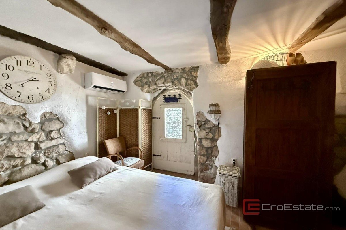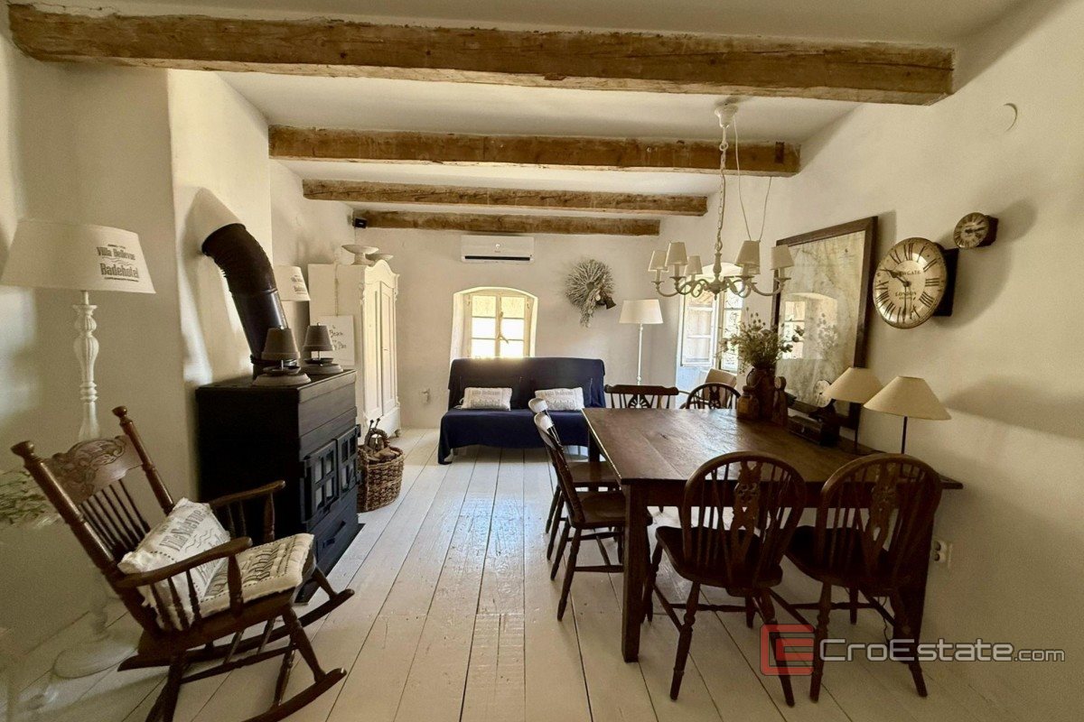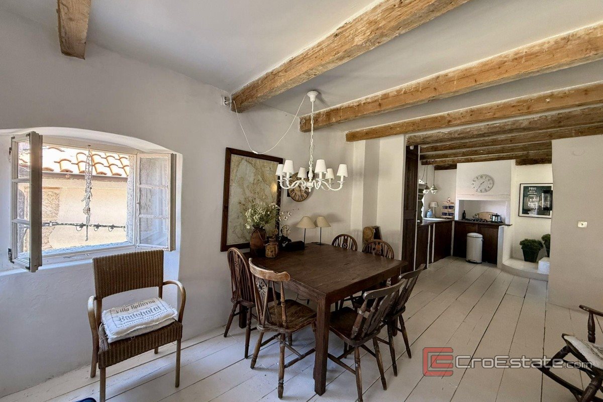 In vendita un'autentica casa in pietra ristrutturata, a schiera, situata nel centro storico di Vrbnik. Con una superficie totale di 120 m², è composta da due appartamenti separati. Al piano terra si trova un monolocale con cucina, bagno e zona notte. Al primo piano, raggiungibile tramite scala esterna, si trova un appartamento su due piani collegato tramite scala interna. Il primo piano comprende un corridoio, una camera da letto e un bagno, la seconda cucina, la sala da pranzo e il soggiorno, e al piano superiore si trova un'ampia terrazza sul tetto con vista aperta sul mare. La casa conserva elementi tradizionali in pietra e uno stile rustico, con una ristrutturazione di qualità e comfort moderni come aria condizionata e camino. L'immobile è adatto per vacanze, residenza o affitto turistico.
