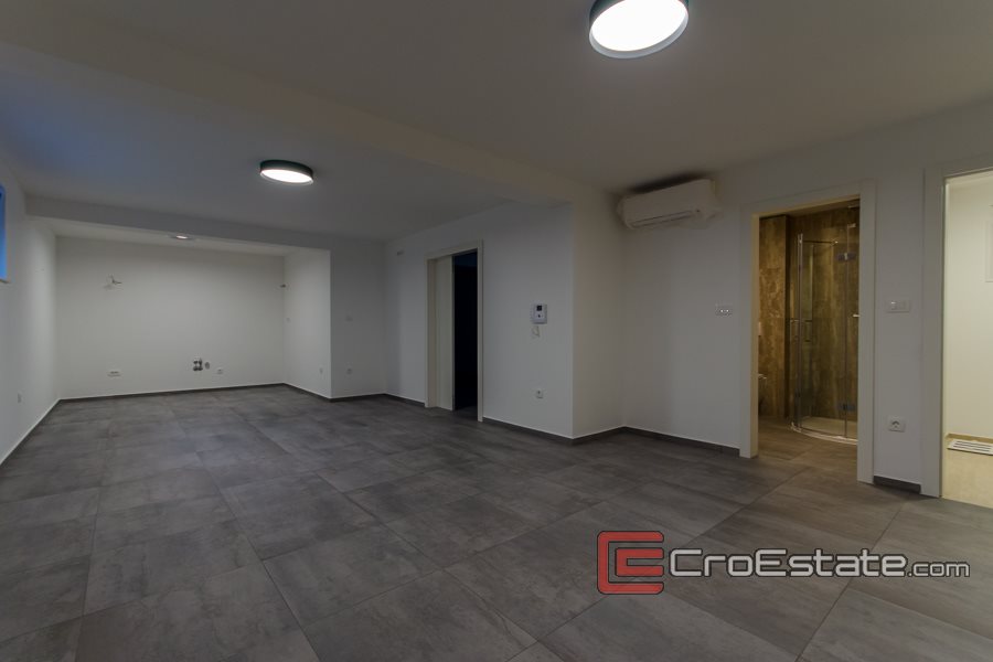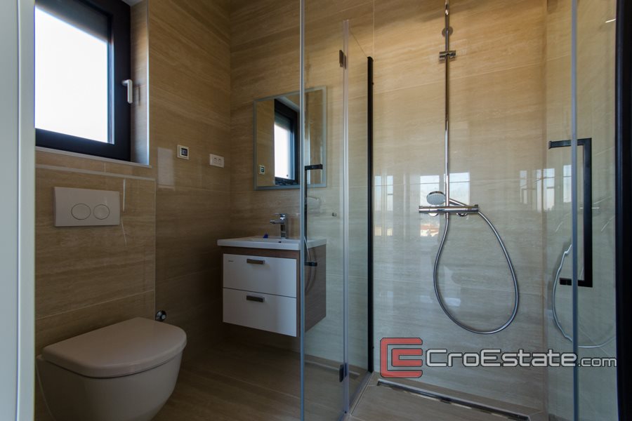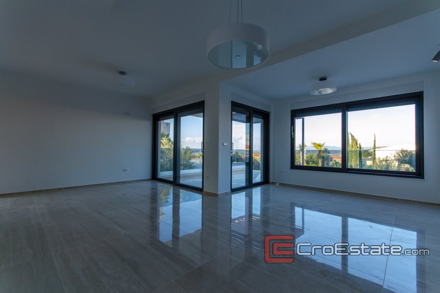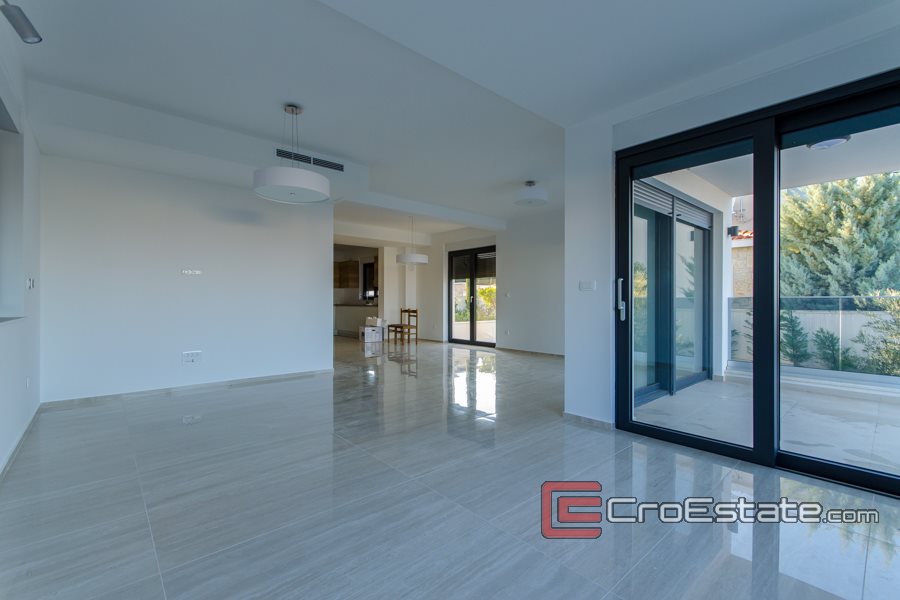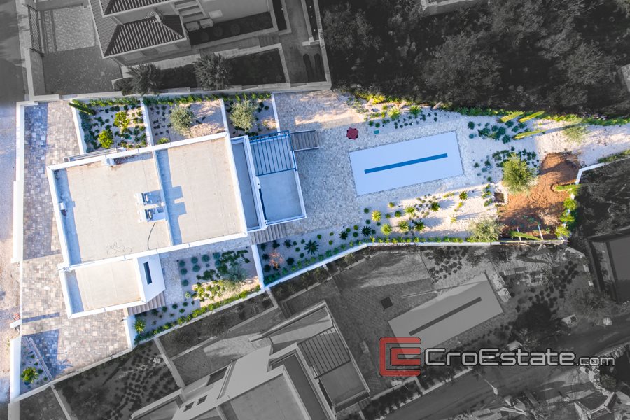 Una scala interna conduce al piano terra, composto da soggiorno con zona pranzo e cucina, dispensa, cantina, wc, terrazzo e garage. Dalla terrazza si accede ad un bellissimo giardino con piscina. Sempre al piano superiore si trova una scala interna dove si trovano tre camere da letto con bagni, disimpegno, terrazzo e balcone con vista mare aperto. Tutti i bagni sono dotati di riscaldamento a pavimento integrato e sistema di illuminazione intelligente delle camere, tapparelle elettriche e armadio a muro. La piscina ha illuminazione incorporata e predisposizione installata per il riscaldamento, mentre la villa ha installato e condotto cavi per la videosorveglianza, il tutto secondo i desideri del futuro proprietario.