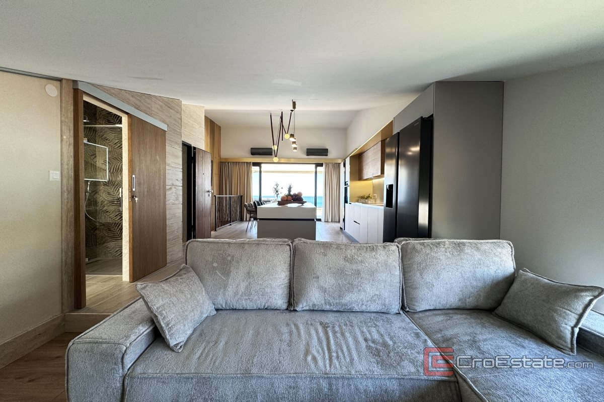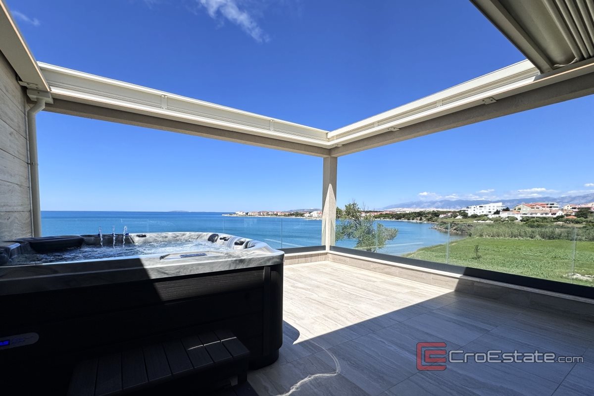 Attraente attico trilocale situato in prima fila al mare sull'isola di Pago. Lo stile moderno dell'arredamento, con ogni dettaglio evidenziato in modo speciale, rende questo attico unico, mentre l'incantevole vista sul mare ne aumenta la bellezza. Si estende su 118 mq di superficie abitativa, elegantemente disposti sugli ultimi due piani di un edificio residenziale più piccolo, la cui architettura moderna è perfettamente integrata nell'ambiente. L'ingresso all'appartamento è possibile tramite ascensore, ma anche tramite scale. Il primo piano è composto dalla parte d'ingresso dell'appartamento, tre moderne camere da letto, ognuna delle quali ha un balcone con una vista unica sul mare e sulla spiaggia, due bagni e ripostigli. Una scala interna conduce al secondo piano, composto da una cucina a pianta aperta e una sala da pranzo con soggiorno. Grazie al concetto aperto e alle grandi pareti di vetro, l'intero spazio è ulteriormente illuminato e offre una favolosa vista sul mare.