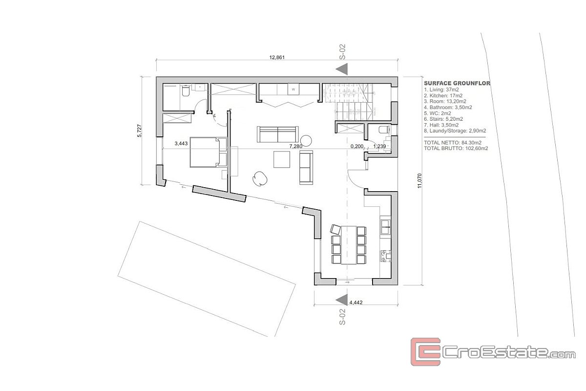 La villa è situata su un appezzamento più grande di 629 m², mentre un appezzamento più piccolo di 117 m² è destinato al parcheggio di più veicoli, offrendo praticità e comfort aggiuntivo.