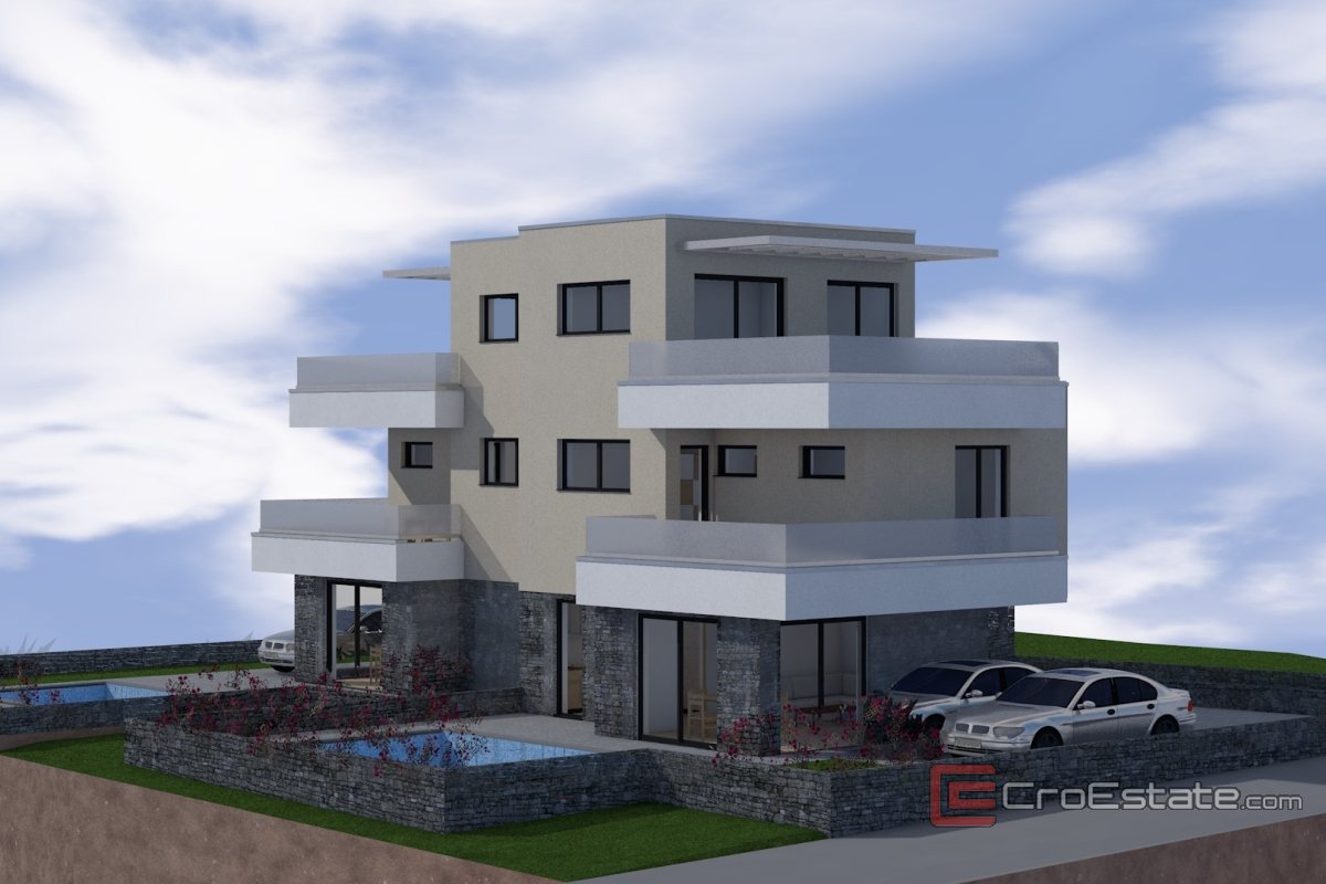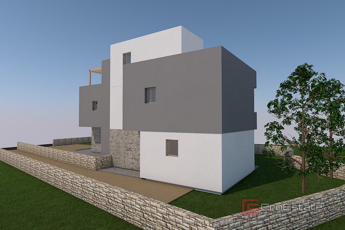 In una posizione tranquilla vicino a Sebenico, sono in costruzione due ville bifamiliari con piscina. Ogni villa si sviluppa su tre piani, con circa 130 m² di superficie abitabile netta, situate su un ampio terreno di 622 m².