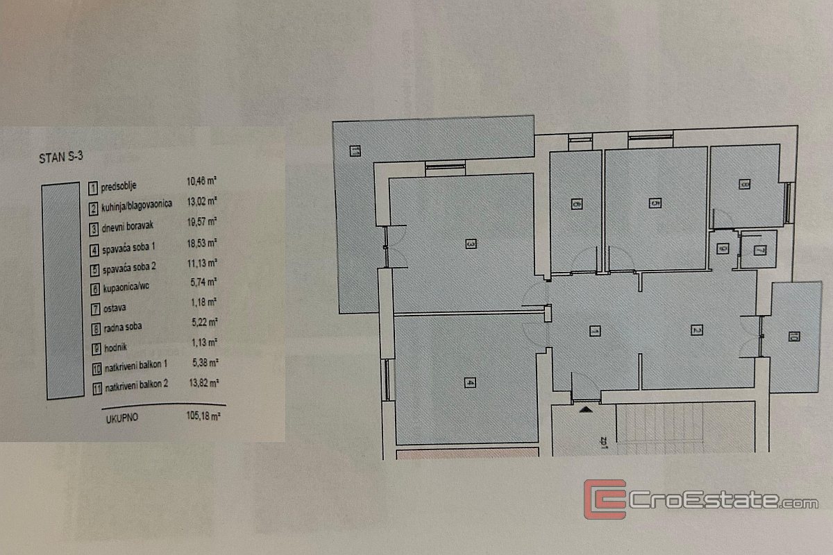 In vendita un appartamento completamente arredato e attrezzato, situato al 1° piano di un piccolo edificio residenziale a Firule. L'appartamento ha una superficie di 91 m² e, grazie al suo orientamento (sud-ovest-nord), gode di molta luce naturale e di un'atmosfera piacevole. È composto da due camere da letto: una con un letto matrimoniale e l'altra con un letto più piccolo e un grande armadio a muro. Vi è inoltre un bagno e un ampio soggiorno che conduce a un balcone, mentre la cucina ha il suo balcone esposto a nord.
