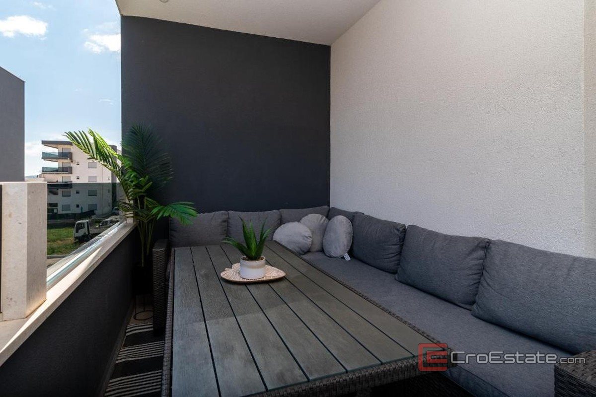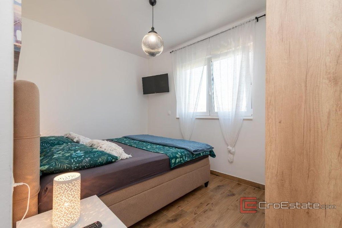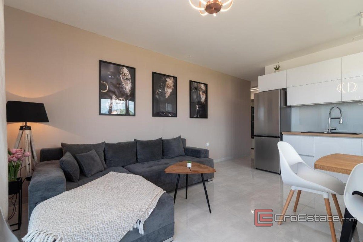 Si trova al secondo piano, è orientato a sud-est e dispone di 53,30 m² di superficie abitabile e 10,70 m² di balcone. Il riscaldamento e il raffrescamento sono garantiti dall'aria condizionata e dal riscaldamento a pavimento in bagno, e l'appartamento include anche un posto auto esterno situato sul retro dell'edificio. L'edificio è stato costruito nel 2020, dispone anche di una piscina ed è arredato e corredato con mobili di qualità, inclusi nella fornitura.