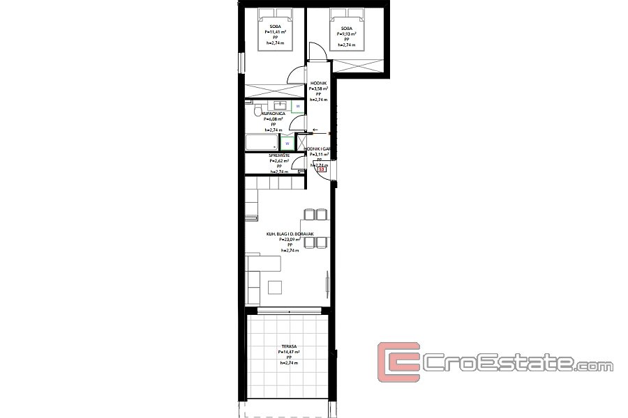 Квартира ориентирована на юг и имеет общую площадь 74,29 м². Состоит из прихожей и гардеробной, двух спален, ванной комнаты, коридора, кухни со столовой и гостиной с выходом на террасу. Он оснащен современным оборудованием, а отопление и охлаждение обеспечиваются теплым полом в ванной комнате и кондиционером в каждой комнате.
