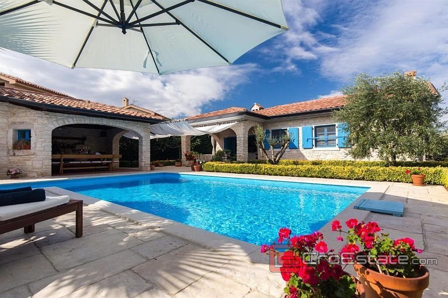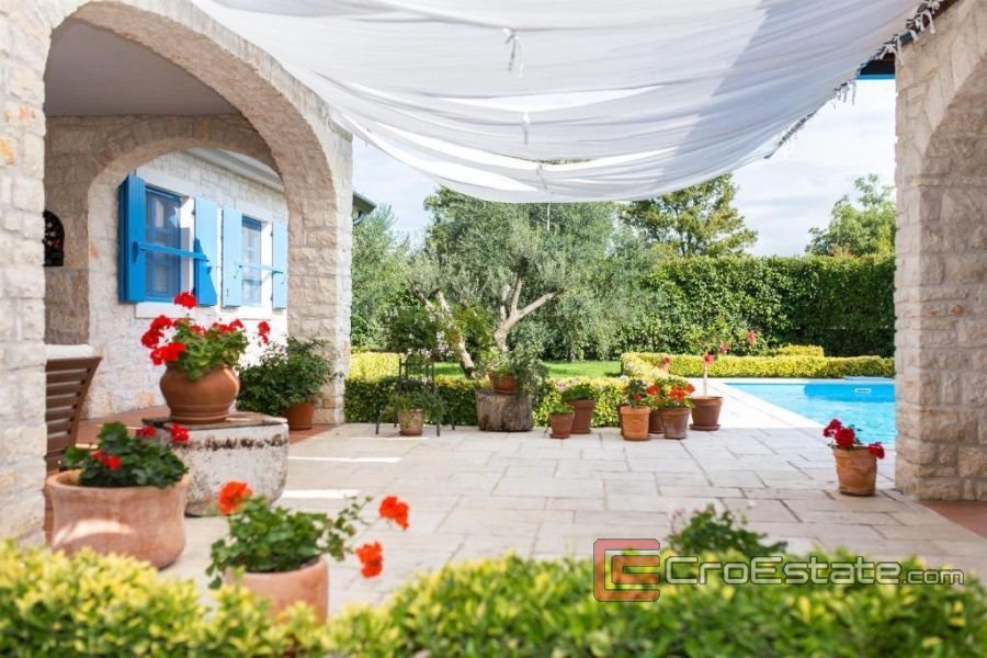 Перед виллой расположена красиво оформленная терраса. Двор состоит из бассейна, зоны для загара, крытой летней кухни с камином и места для общения.