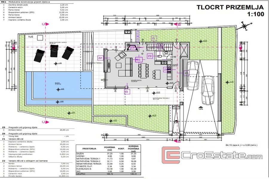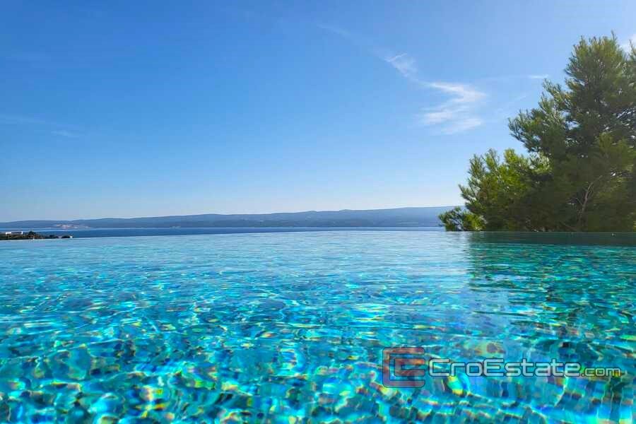 - На первом этаже находится одна ванная комната, кухня, столовая и гостиная открытой планировки с прямым выходом на террасу, зону для загара и открытый бассейн с подогревом.