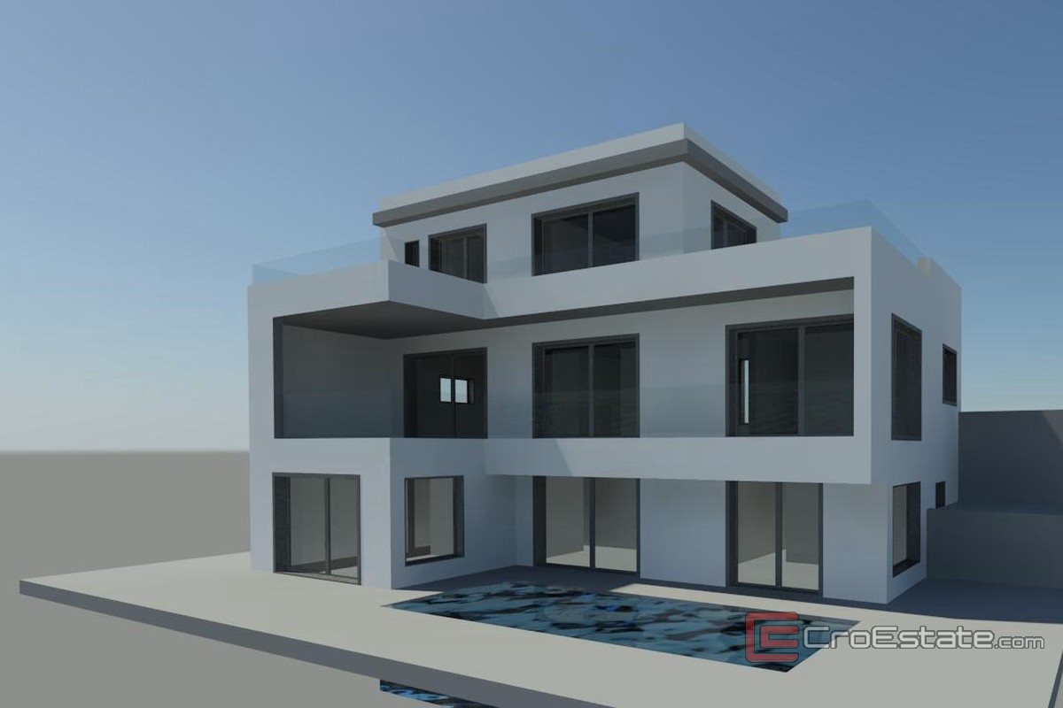 Участок площадью 451 м² расположен в Трогире, в смешанной зоне. К участку ведет общественная подъездная дорога, рядом находятся все необходимые подключения к воде и электричеству. Согласно разрешению, планируется построить виллу площадью около 200 м² с бассейном и видом на море.