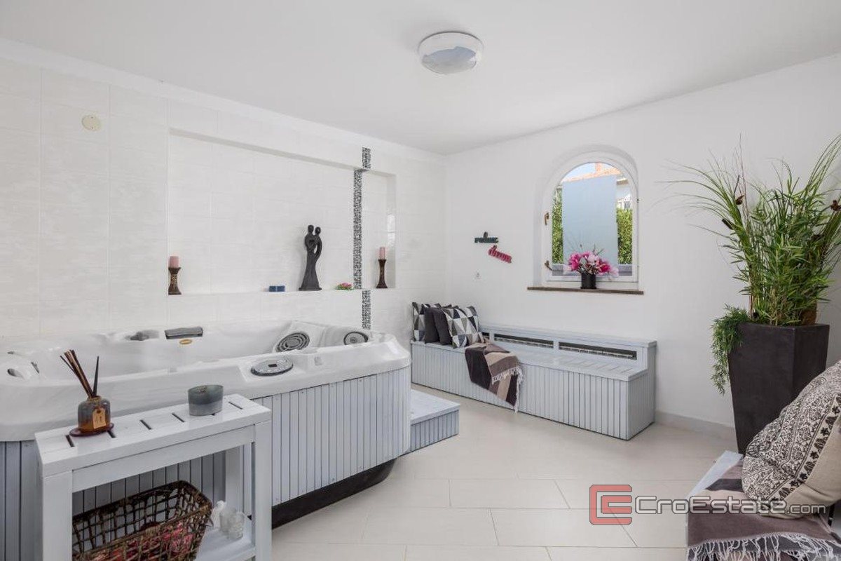 Основная резиденция расположена на первом этаже, где есть большая гостиная со столовой открытой планировки с выходом на большую террасу и сад, откуда открывается вид на открытое море, большая центральная кухня, ванная комната с душем, фойе с офисным помещением, спальня 14 м2 с небольшой ванной комнатой, летней кухней и прачечной с отдельным выходом, соединенным с закрытым садом на западной стороне виллы, где есть большой мраморный и деревянный стол и каменная печь для хлеба, отлично подходит для барбекю и развлечений на свежем воздухе, затем СПА-зона с отдельным входом, с тренажерным залом, джакузи, сауной и ванной комнатой, а также два полностью отдельных гостевых апартамента, которые имеют отдельный вход с северной стороны собственности.