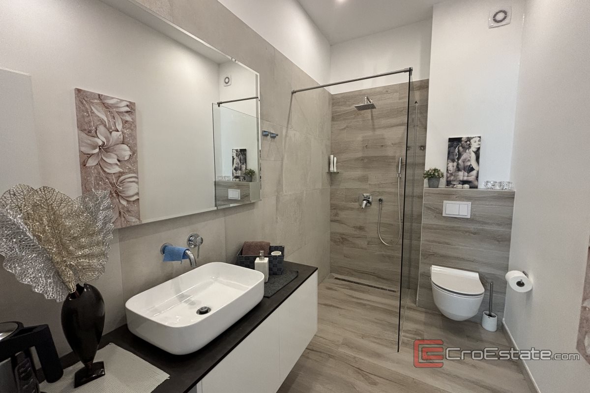 Dnevni dio ima izlaz na prostranu terasu s bazenom i ležaljkama te ljetnom kuhinjom i kaminom. Na prvom katu su raspoređene tri spavaće sobe, svaka s vlastitom kupaonicom, dok jedna od soba ima i izlaz na lođu. Etaže povezuju unutarnje stepenice koje, osim funkcionalne vrijednosti, doprinose i estetici.