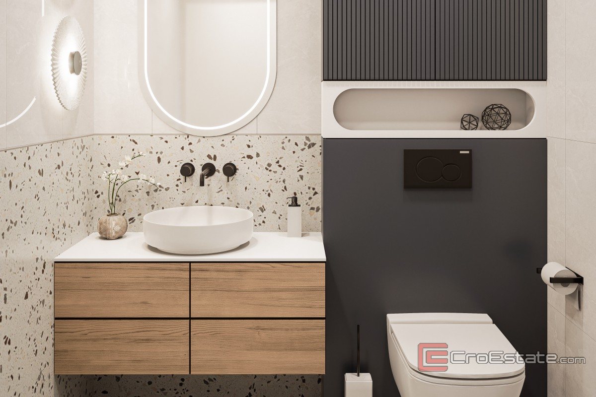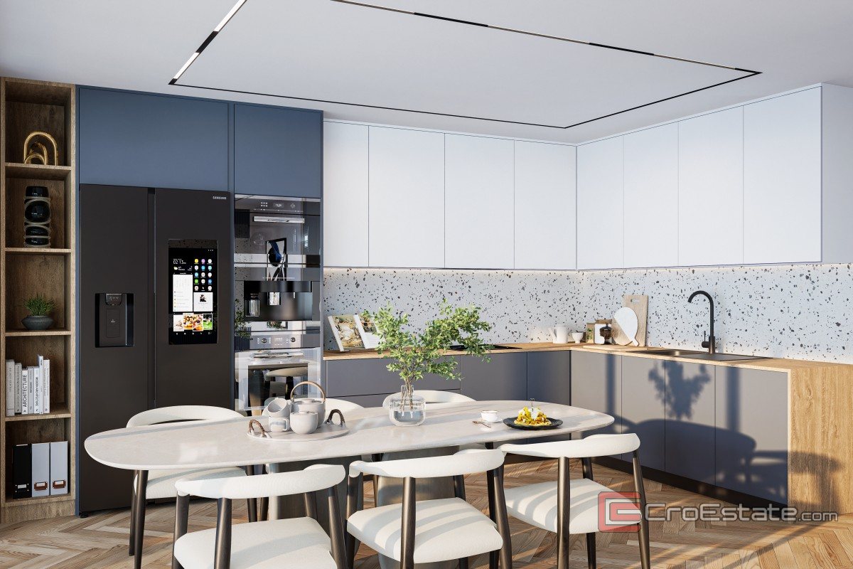 Ovaj stan u novogradnji opremljen dizalom je smješten na drugom katu objekta s otvorenim panoramskim pogledom na more, dok se na četvrtoj etaži nalazi krovna terasa. Ima 94,85 m² stambenog prostora i sastoji se od dnevnog dijela s izlazom na balkon s pogledom na more, hodnika, dvije spavaće sobe, dvije kupaonice te praonice. Unutarnje stubište vodi na iduću etažu gdje je smještena ostakljena krovna terasa koja se može opremiti po želji kupca i toalet.