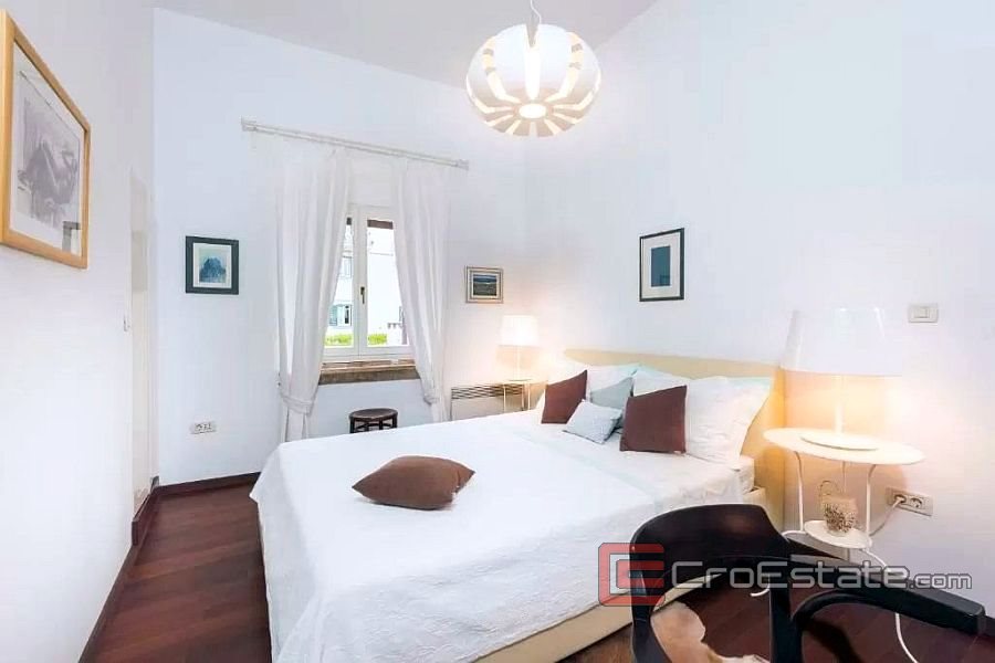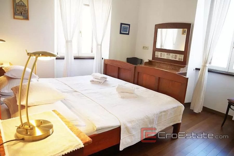 Iznajmljuje se dugoročno elegantan dvosobni stan površine 63 m2 sa visokim plafonima smješten na rivi grada Hvara na trećem katu (zadnji) manje stambeno-poslovne zgrade. Apartman se sastoji od kuhinje i dnevnog boravka, dvije spavaće sobe i kupaonice, te ima dva prozora sa kojih se pruža pogled na more i prekrasnu hvarsku rivu. Stan je kompletno opremljen i namješten. Atraktivna lokacija je čini idealnim izborom za življenje.