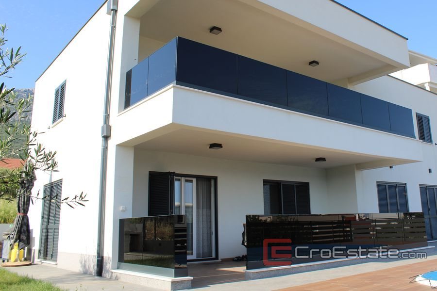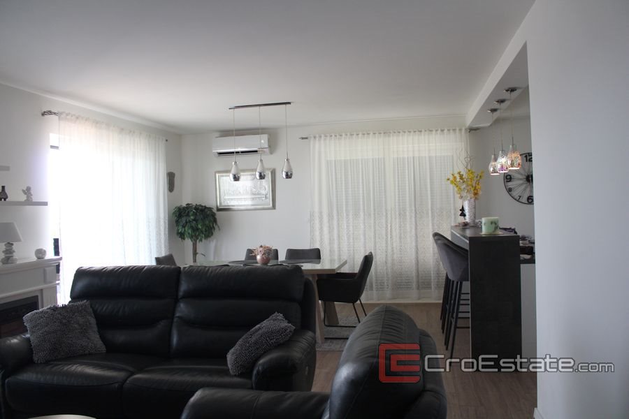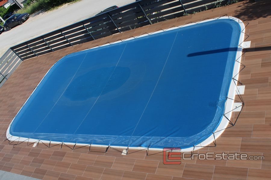 Kuća ima 2 kata. Na 1. Katu je stan sa 3 spavaće sobe, kuhinjom i blagovaonicom, dnevnim boravkom i 3 kupatila, saunom sa izlazom na predivnu terasu sa grijanim bazenom. Na 2. Katu je neuređen stan sa 3 spavaće sobe, 3 kupaonice, kuhinjom sa blagovaonicom i dnevnim boravkom i balkonom sa pogledom na morem.