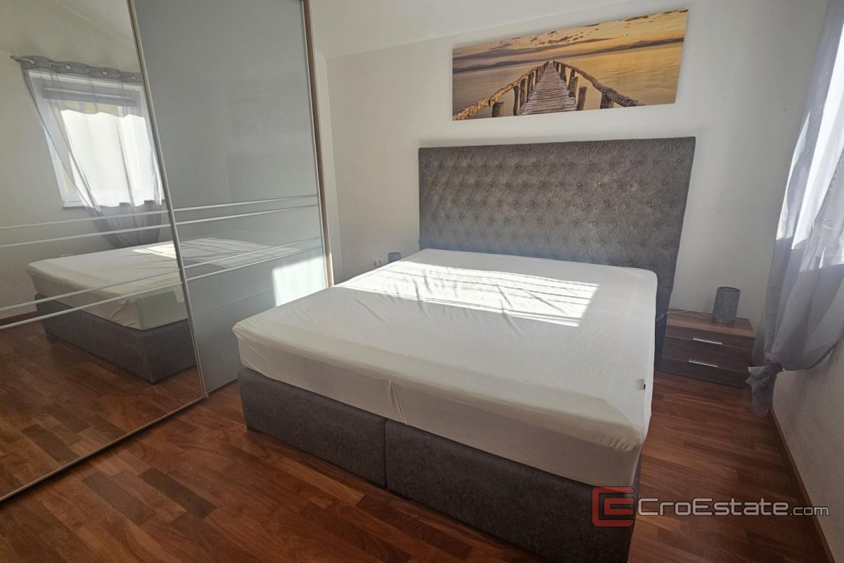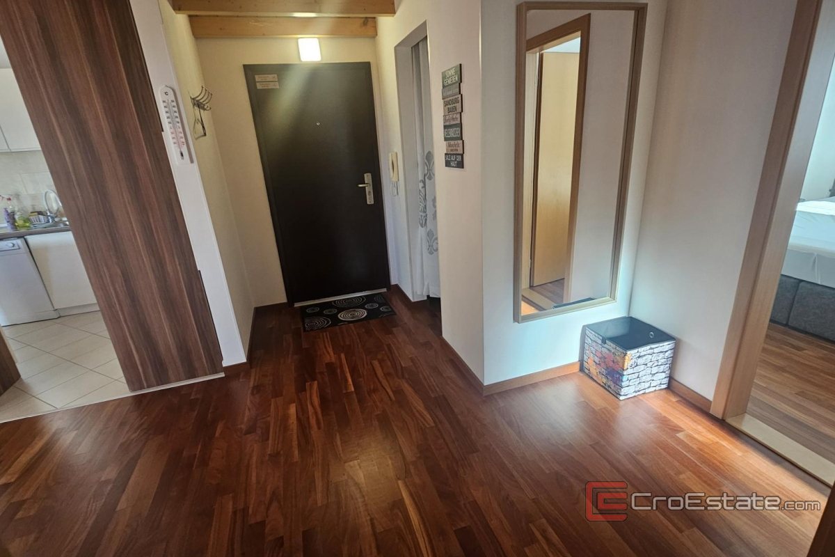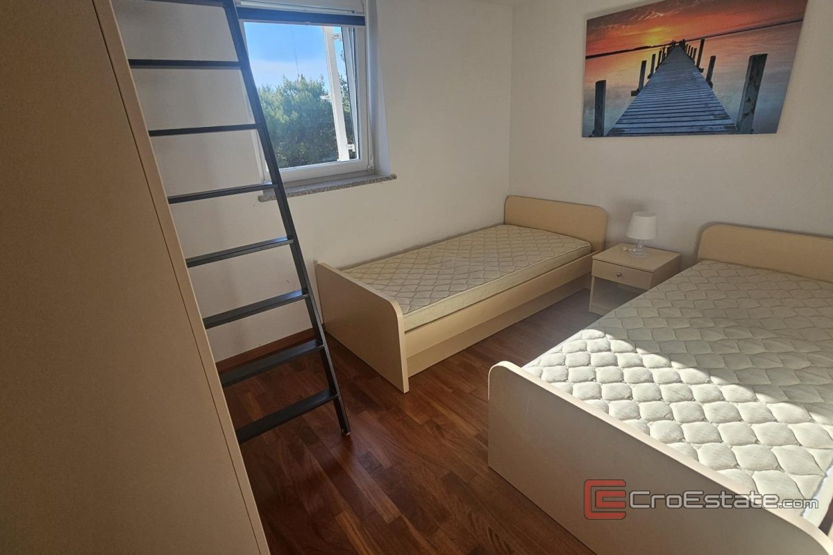 Prodaje se apartman u uvali Soline, na otoku Krku, ukupne površine 64 m². Smješten je na drugom katu kuće s više stambenih jedinica i obuhvaća ulazni hodnik, ostavu, kuhinju s blagovaonicom i dnevnim boravkom, dvije spavaće sobe, kupaonicu te loggiu s pogledom na more. Dodatni prostor osiguravaju dvije galerije s ležajevima i dnevnim boravkom. Apartman je u potpunosti namješten, opremljen, ima PVC vanjsku stolariju, podno grijanje u kupaonici te klimatizaciju. Pripada mu jedno parkirno mjesto u zajedničkom dvorištu. Lokacija je mirna, svega 350 m od plaže i blizu svih potrebnih sadržaja.