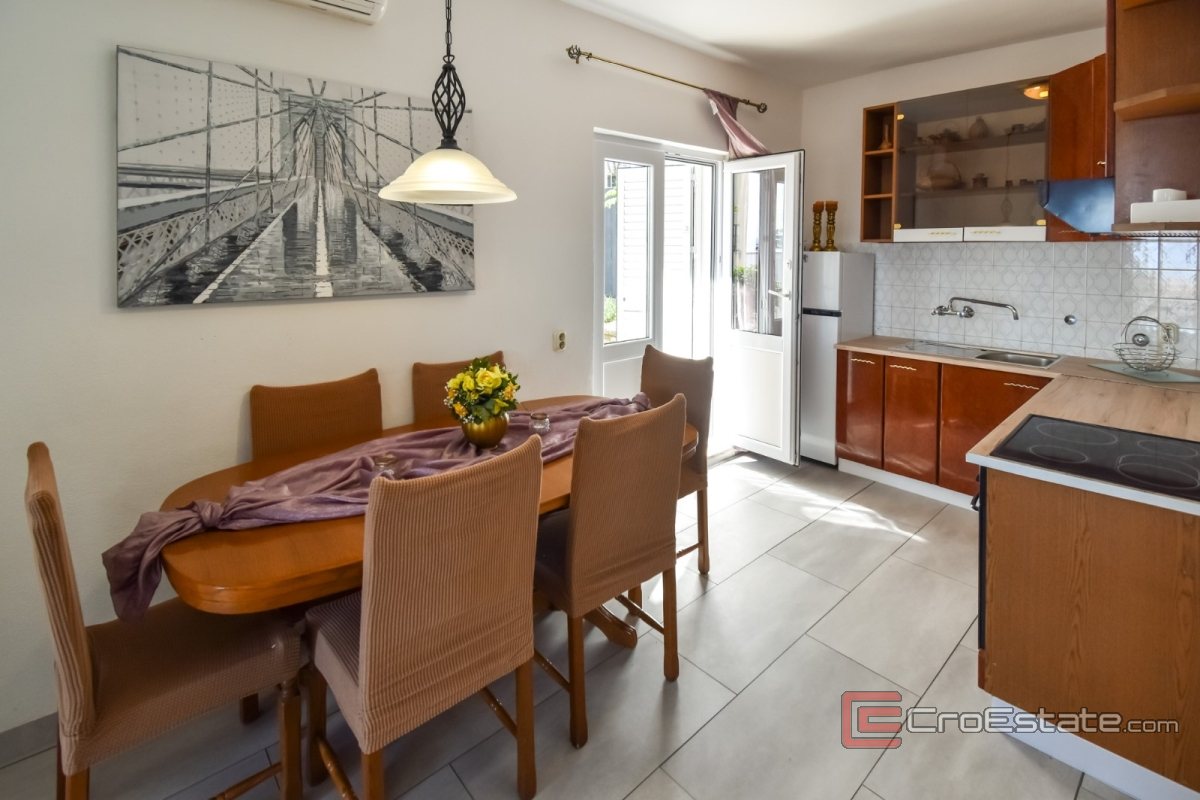 Na prvom katu se nalaze se 2 apartmana od kojih 1 apartman ima 2 sobe, kuhinju/blagovaonicu + dnevni boravak, 3 kupaonice, 2 ostave i 3 terase sa kvalitetnim vrtnim namještajem, kuhinjom i roštiljem. Apartman 2 na prvom katu ima 5 soba, kuhinju, 5 kupaonica, 4 balkona i ostavu.