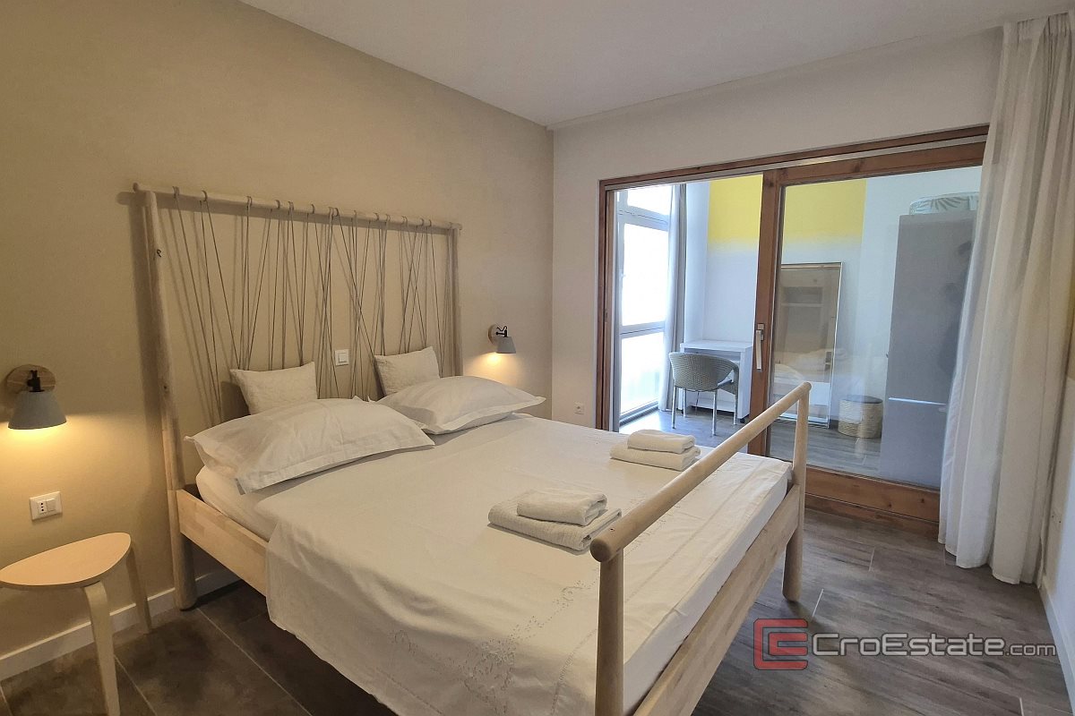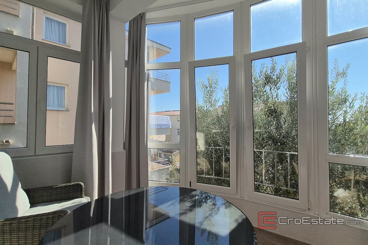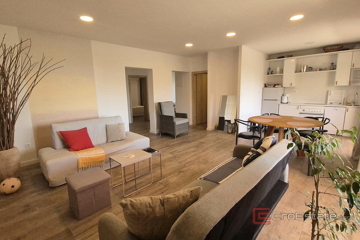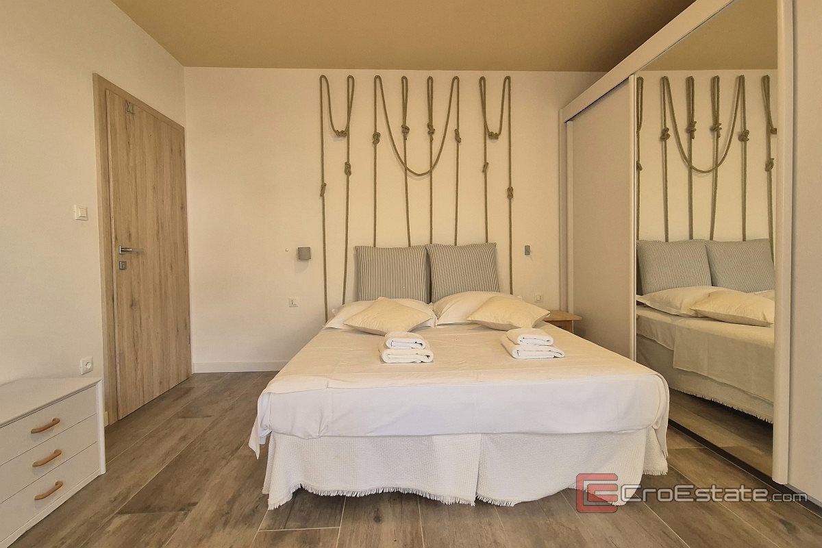 Ovaj moderno uređen stan nalazi se na prvom katu zgrade i prostire se na ukupnoj neto površini od 122,27 m². U stanu se nalazi funkcionalan hodnik koji vodi do prostrane kuhinje i svijetlog dnevnog boravka, savršenog za obiteljska okupljanja. Tu su smještene dvije udobne spavaće sobe, kao i kupaonica i WC. Osim toga, tu su i dodatni prostori poput garderobe, loggie i verande, gdje možete uživati u svježem zraku. Terasa nudi djelomičan pogled na more, što je idealno mjesto za opuštanje i sunčanje. Stan dolazi potpuno namješten, što ga čini spremnim za useljenje ili iznajmljivanje. Smješten je u blizini svih potrebnih sadržaja, uključujući trgovine i restorane, čime postaje savršena opcija za obiteljski život ili turističko iznajmljivanje. Nalazi se 1,5 km od centra grada.