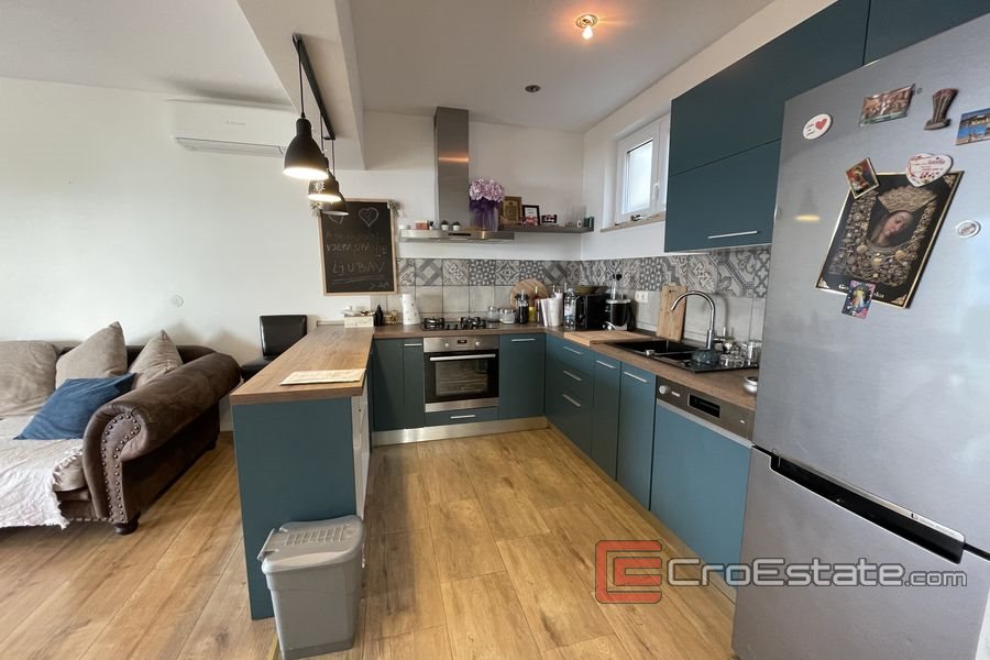 U prizemlju se nalazi natkrivena terasa od 46 m2, a ispred se nalazi vrt od 240 m2. Na prvom katu nalazi se namješten stan stambene površine 74 m2. Stan se sastoji od ulaznog hodnika, dvije spavaće sobe, kupaonice, kuhinje s blagovaonicom, dnevnog boravka s direktnim izlazom na terasu od 45m2 s prekrasnim pogledom na more.
