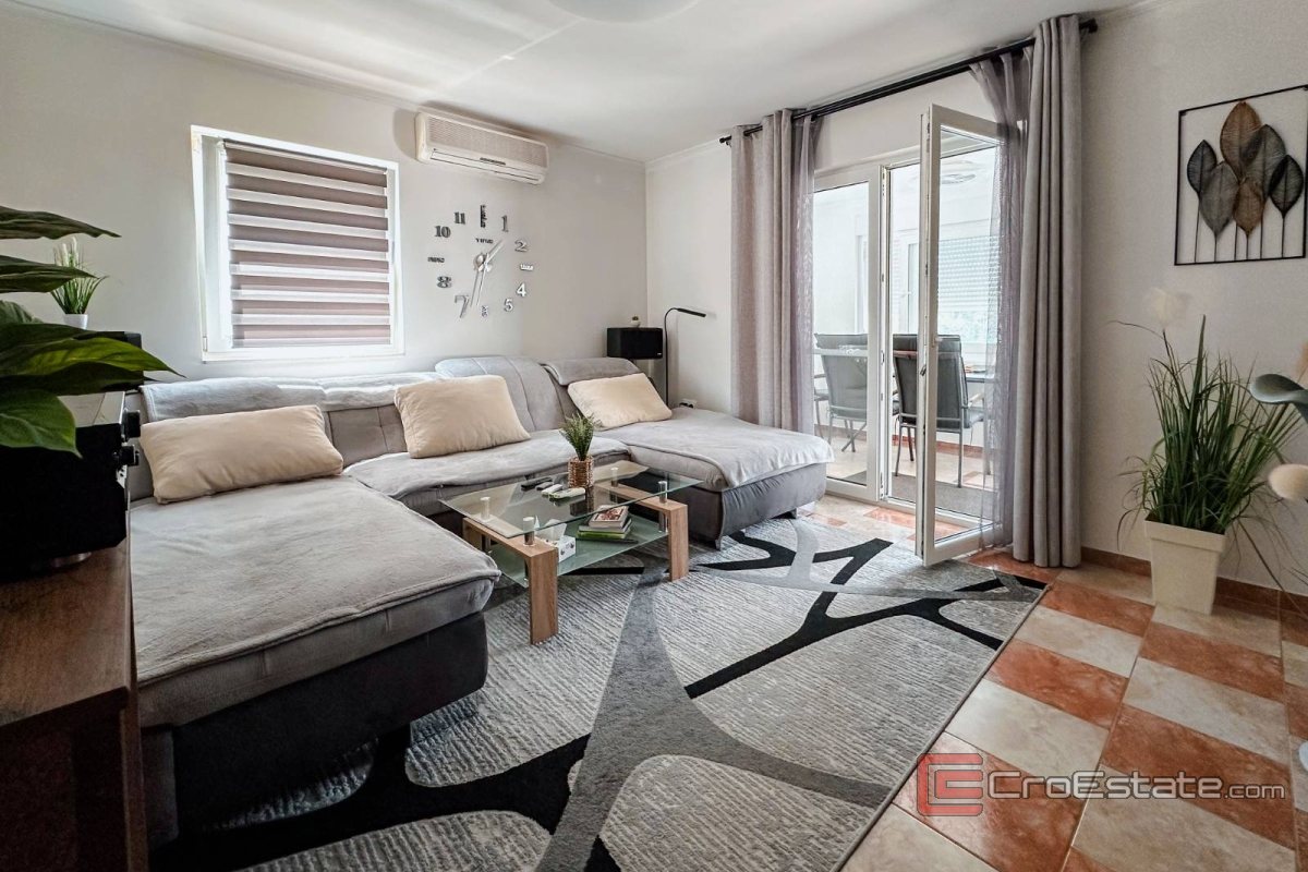 Prodaje se trosobni stan u prizemlju manje zgrade. Sastoji se od ulaznog dijela koji vodi u dnevni boravak spojen s kuhinjom. Hodnik povezuje dnevni boravak s tri sobe – od kojih je jedna trenutno uređena kao manja TV soba. Uz sobe se nalaze dvije kupaonice: jedna s kadom, druga s tušem.