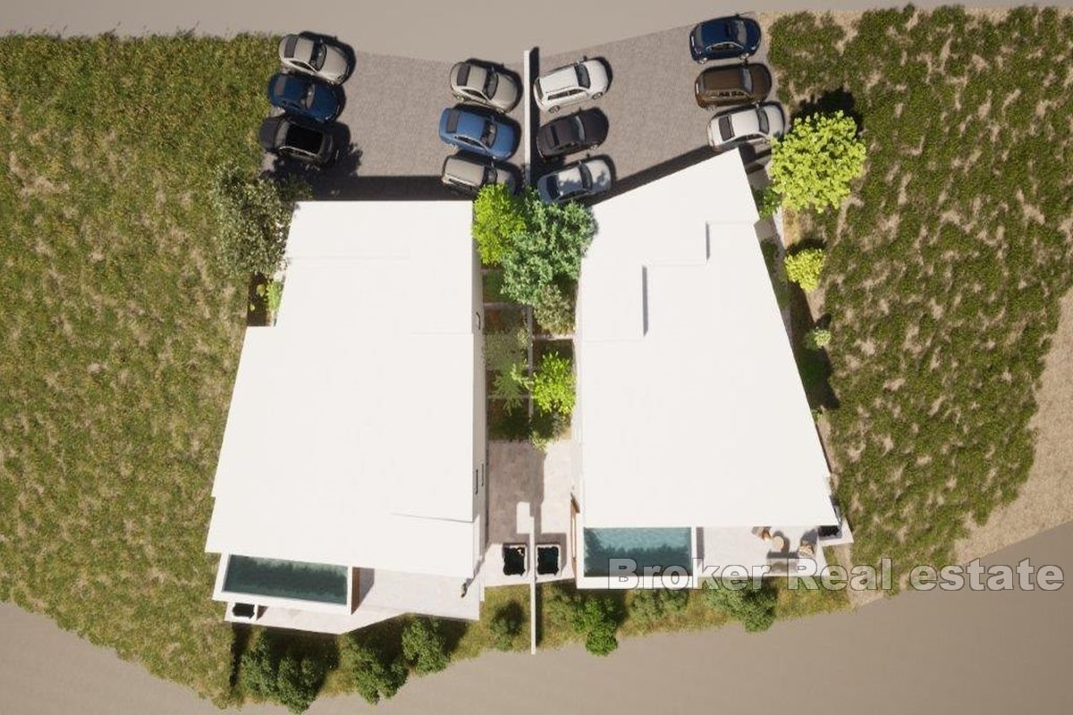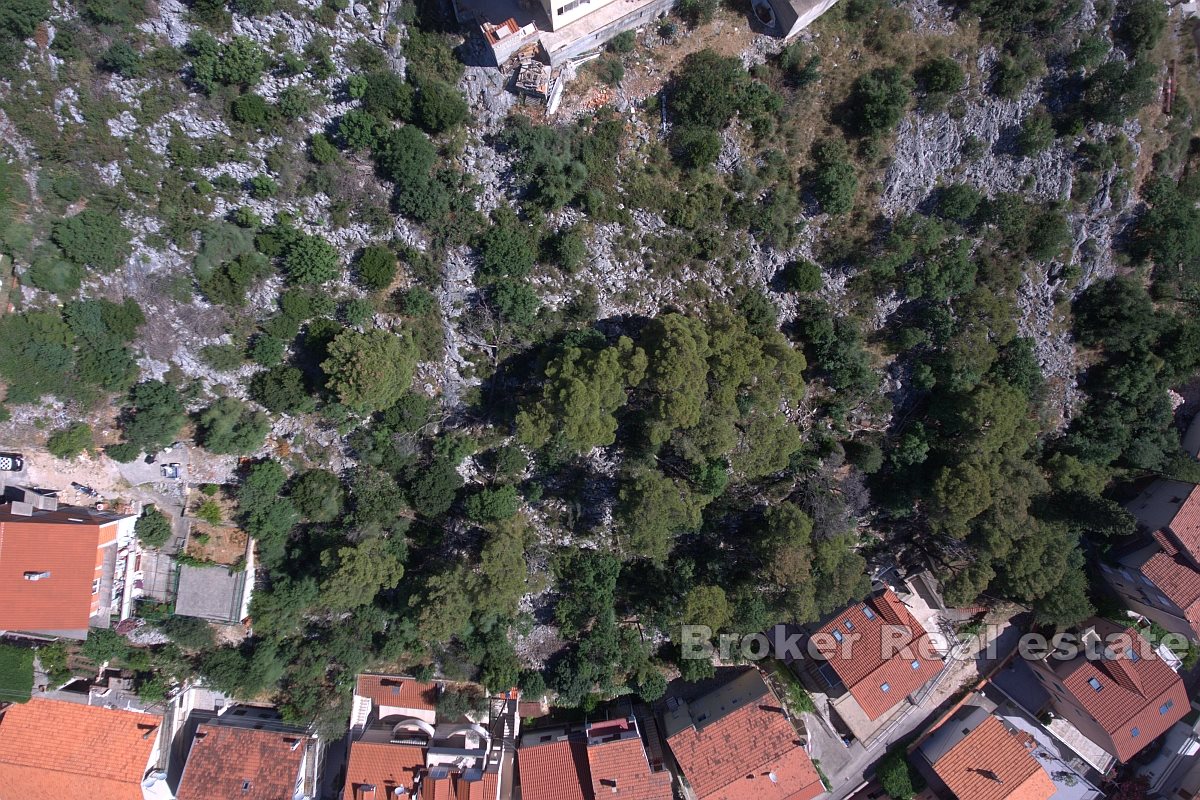 Ukupna površina parcele je 1465m2. Uz samu parcelu su svi priključci. Pristupni put je uredan. S parcele se pruža pogled na more. Udaljeno cca. 750 m od centra, zračnom linijom. Prodaje se skupa sa ishodovanom dozvolom za gradnju 2 zgrade.