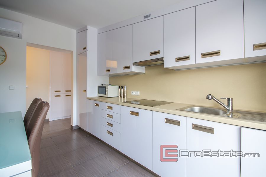 Svi apartmani imaju izlaz na terasu sa spektakularnim pogledom na prirodni okoliš i more udaljeno 400 metara od kuće. Ukupne površine 70 m2 u prizemlju se nalaze garaža i skladišni prostor.