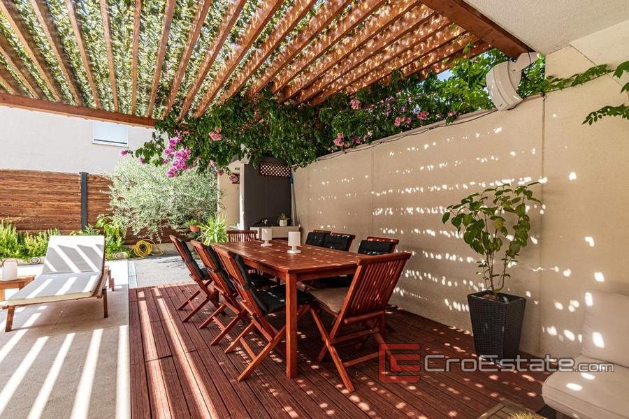 Stan se nalazi u prizemlju stambene zgrade te se sastoji od dvije spavaće sobe, kuhinje, blagovaonice i dnevnog boravka s omogućenim izlazom na vanjsku terasu površine 110m2 na kojoj je smješten bazen, sunčalište i vanjski namještaj.