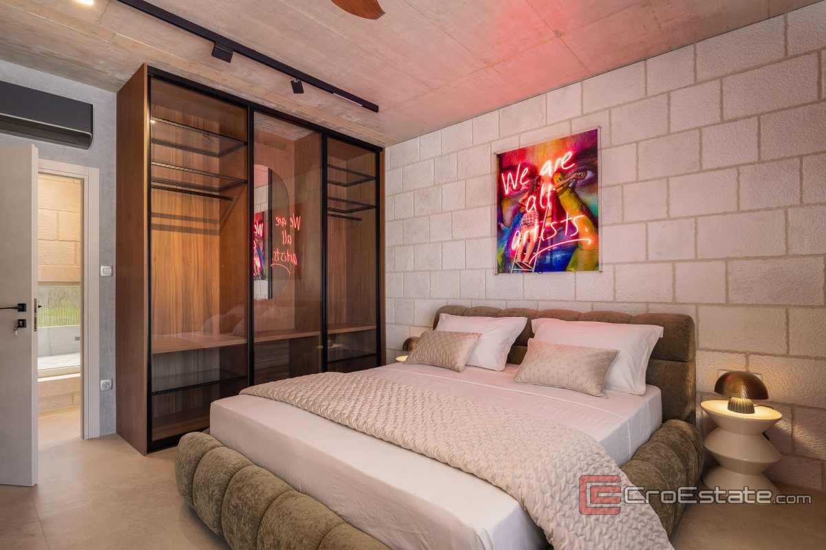 U drugom dijelu vile nalaze se četiri moderne spavaće sobe, svaka sa svojom kupaonicom. Opremljene su vrhunskim king size krevetima i madracima svjetski poznatih brendova. Jedna od spavaćih soba ima kadu iz koje se pruža pogled na prekrasno zelenilo. Važno je napomenuti da klimatizacijski sustav pokriva cijeli interijer vile, a vila također ima i podno grijanje. Grijanje vode i cijele vile upravlja se iz strojarnice, putem cijevi koje su postavljene ispod zemlje. Vila je također opremljena bežičnim internetom i satelitskom televizijom na pet televizora.