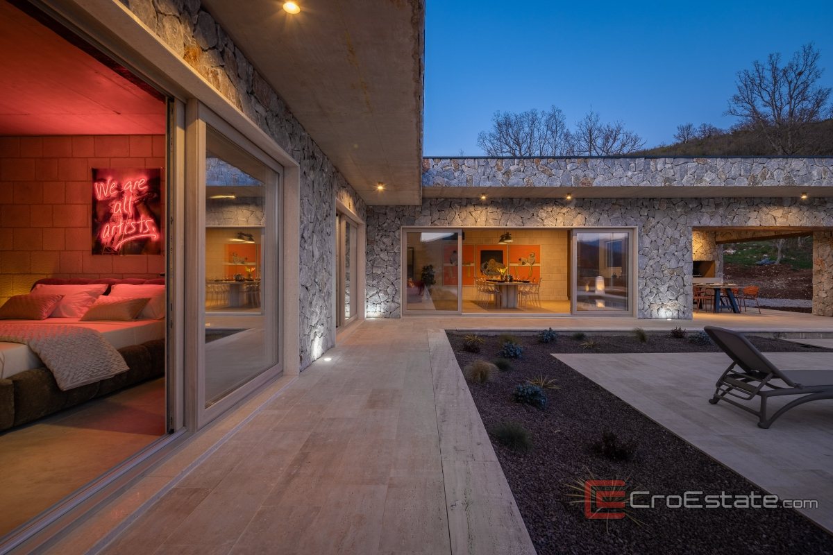 Vila sadrži prostranu kuhinju i dnevni boravak, četiri spavaće sobe, četiri kupaonice s toaletima, grijani vanjski bazen od 45m2 sa posebnim vrstama keramike, vrtnu garnituru visoke kvalitete s ugrađenim kaminom za pripremu delicija, hortikulturu od 100 biljki oko samog objekta, 20 maslina starosti od preko 30 godina, vanjsko parkiralište, vanjski toalet i tuš, teniski teren 17x34 sa umjetnom travom i reflektorima, ambijentalno svijetlo od 100 led svjetiljki oko čitave kuće, dodatne sportske sadržaje te otvorenu, djelomično natkrivenu terasu.