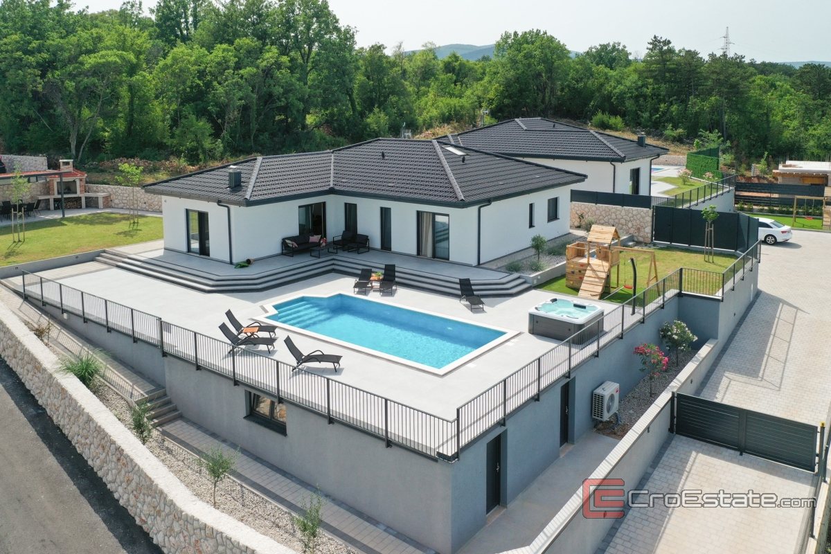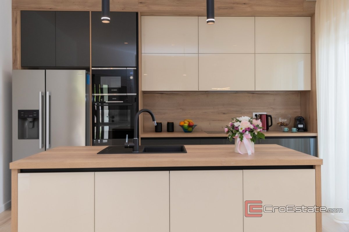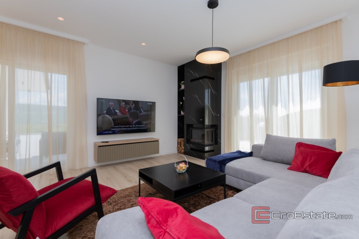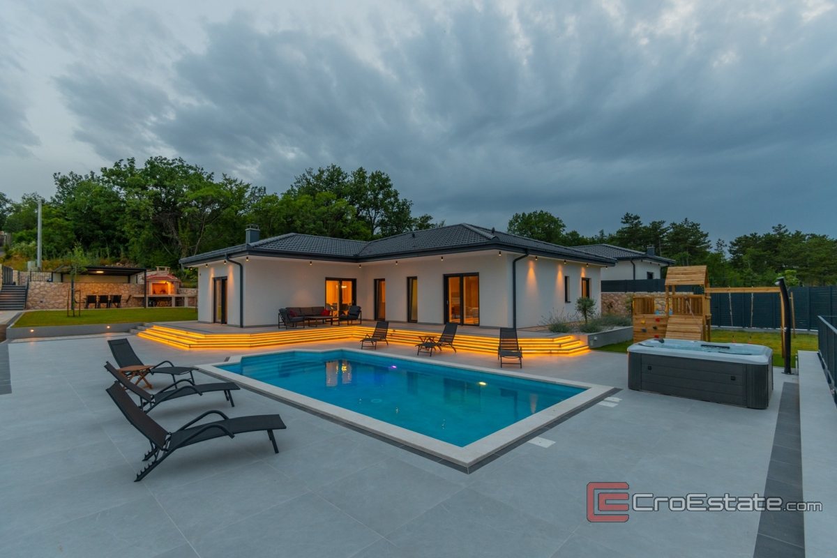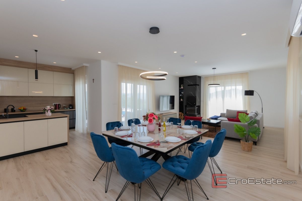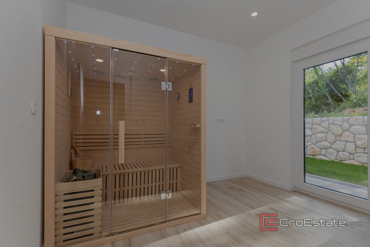 Unutrašnjost obuhvaća prostrani open space dnevni boravak s kuhinjom i blagovaonicom, tri udobne spavaće sobe, tri moderno uređene kupaonice, dodatni gostinjski toalet te wellness prostor sa saunom. U vanjskom dijelu nalazi se jacuzzi, pažljivo uređen vrt s kutkom za opuštanje, dječje igralište i prostor s kaminom koji dodatno obogaćuje doživljaj boravka.