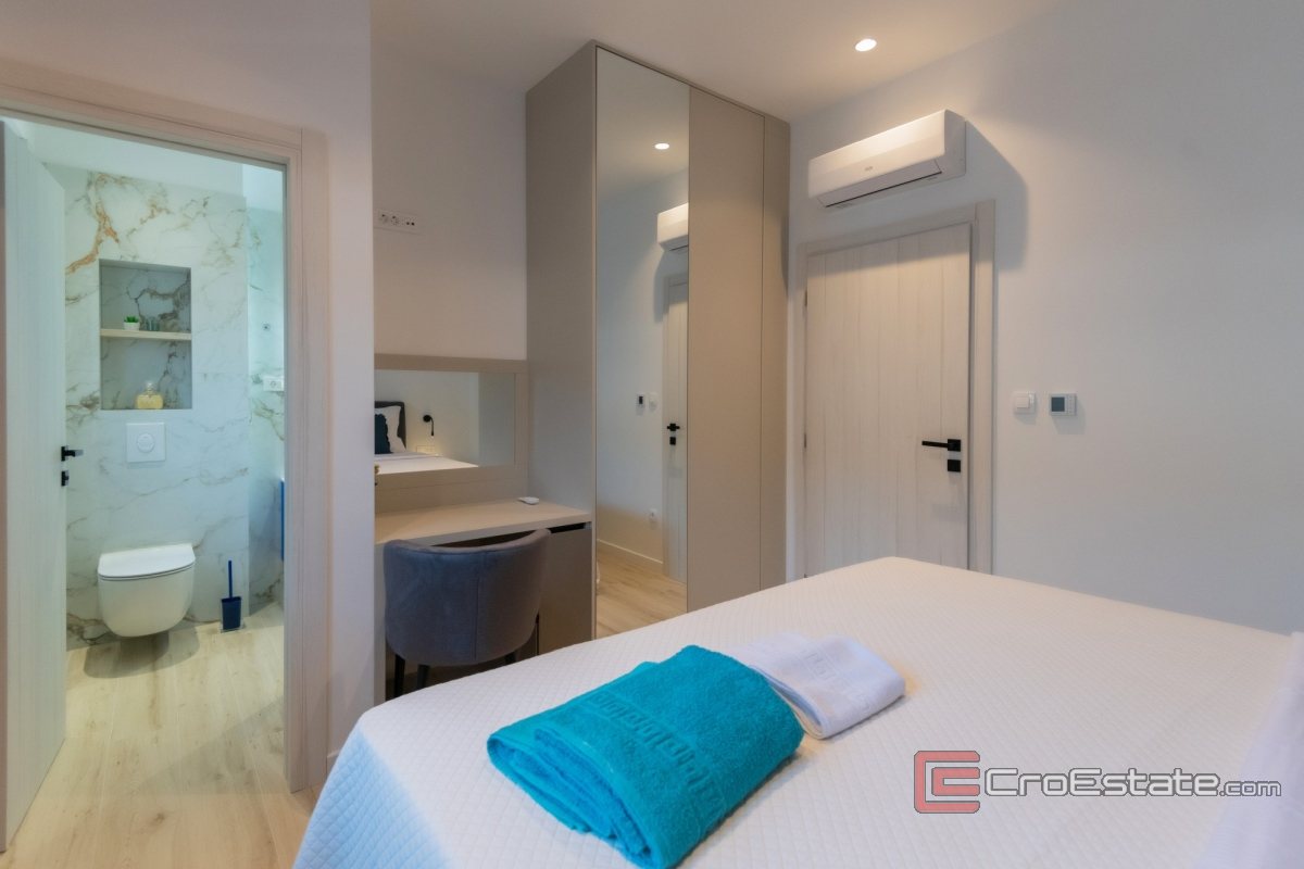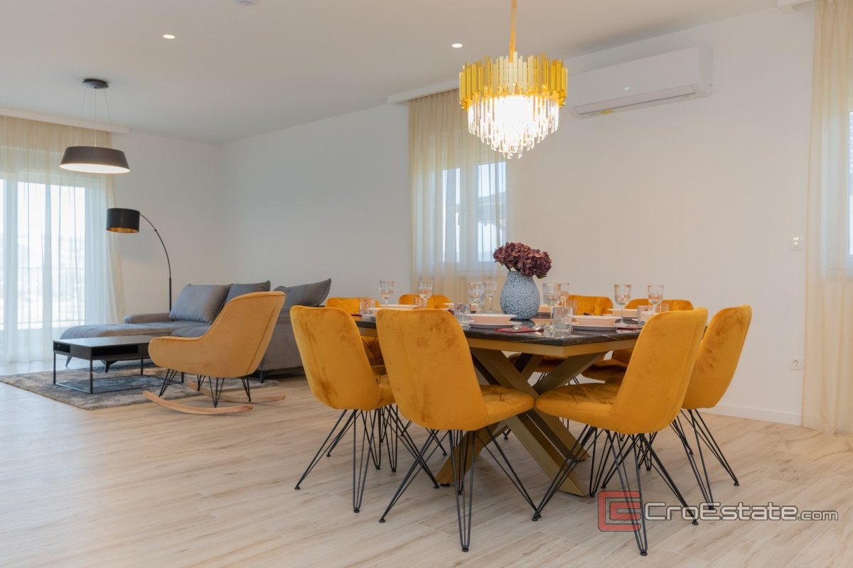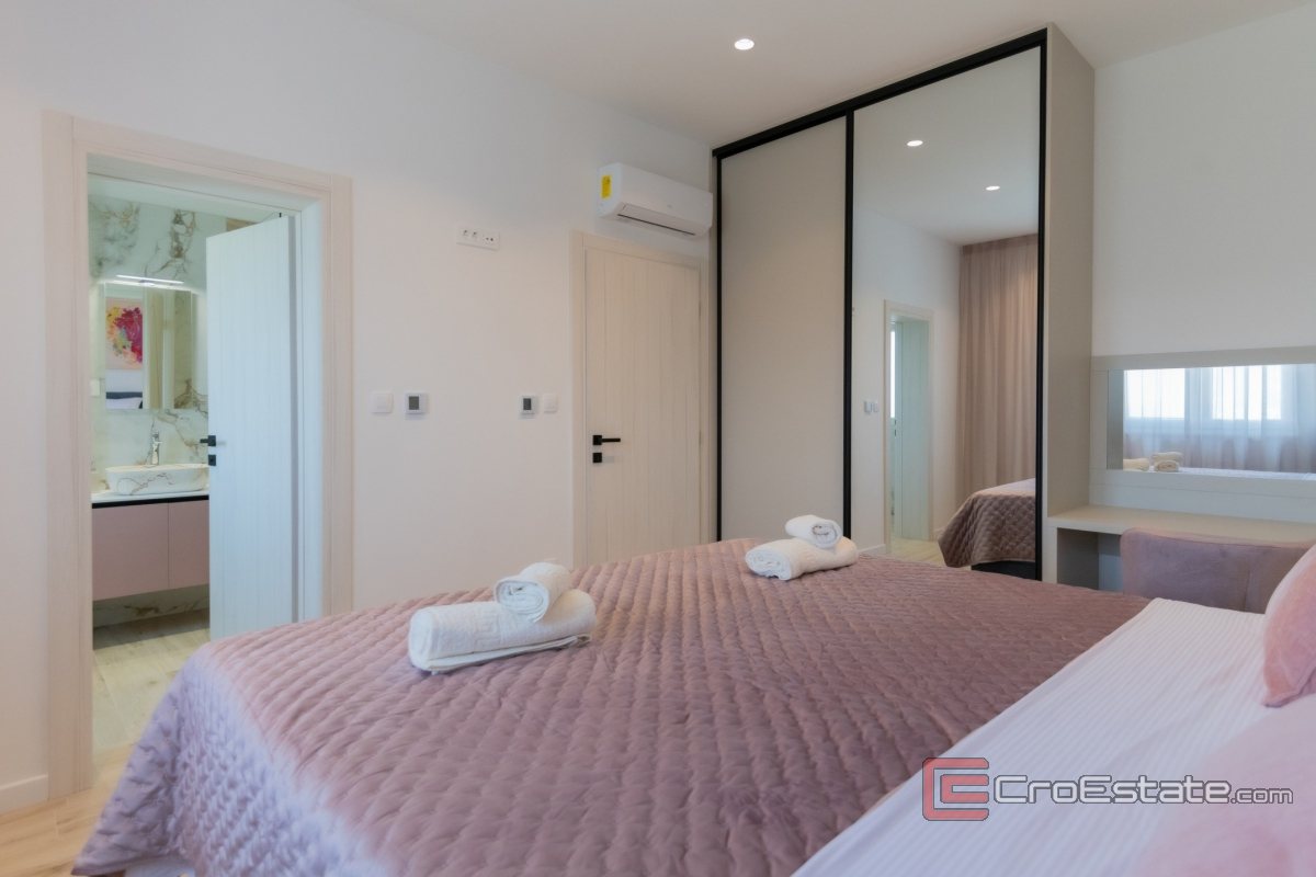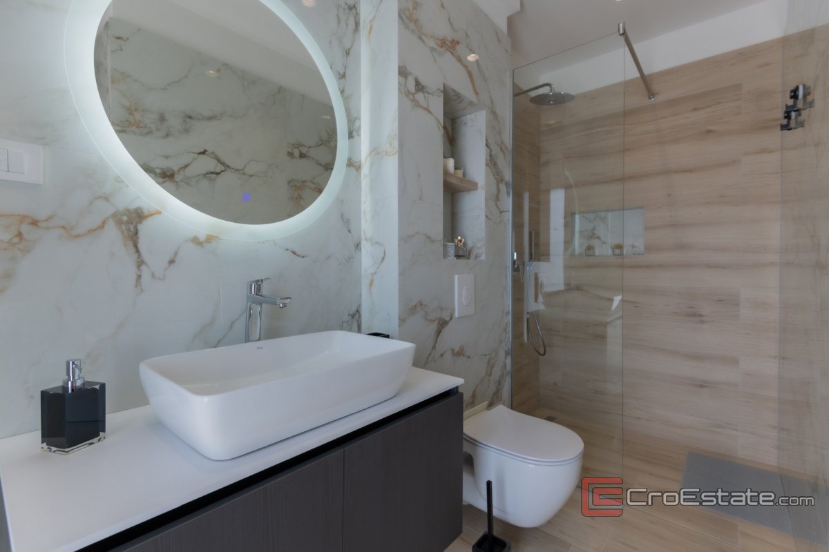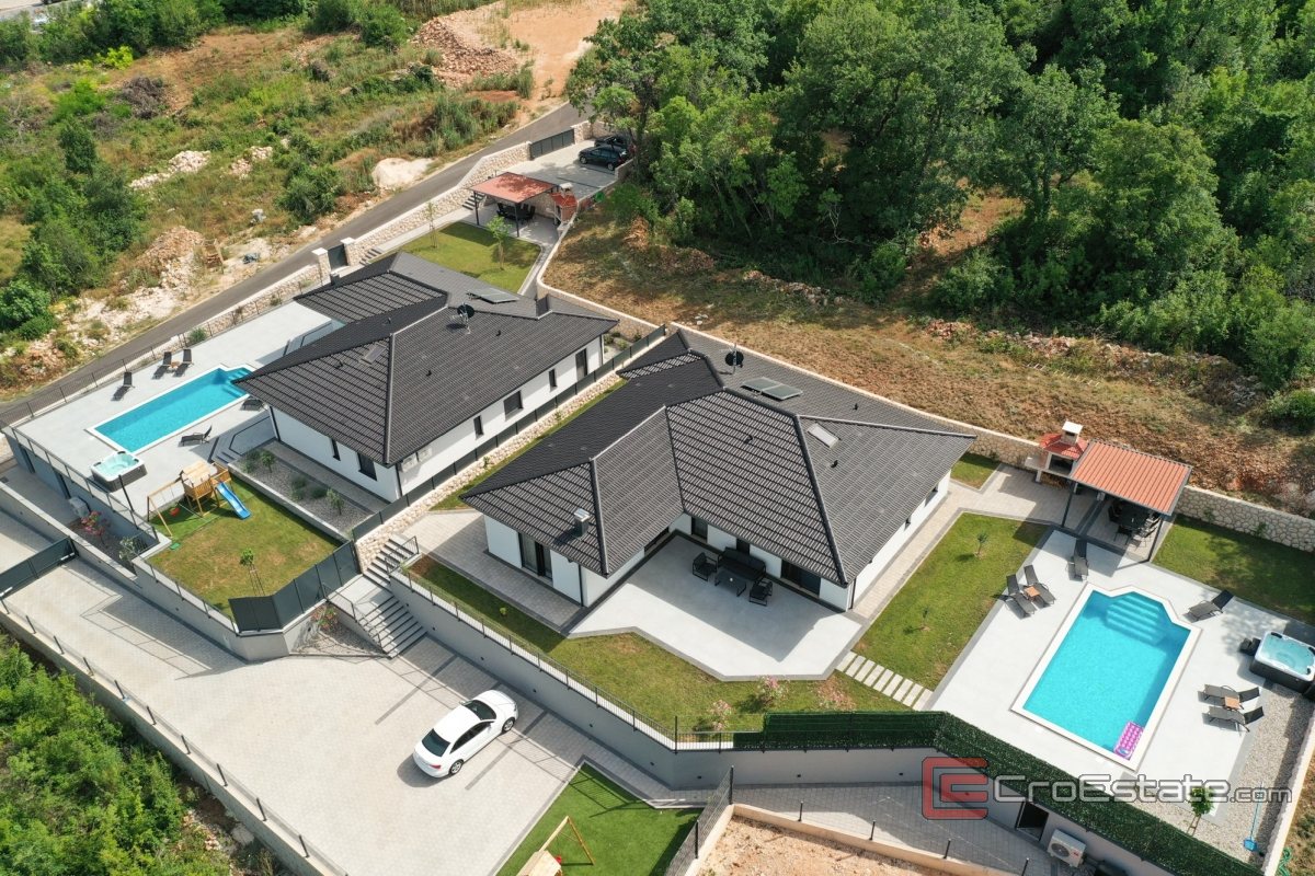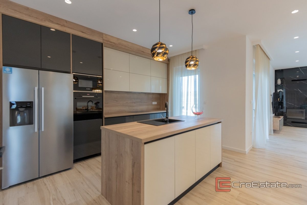 Unutrašnjost obuhvaća prostrani open space dnevni boravak s kuhinjom i blagovaonicom, tri udobne spavaće sobe, tri moderno uređene kupaonice, dodatni gostinjski toalet te wellness prostor sa saunom. U vanjskom dijelu nalazi se jacuzzi, pažljivo uređen vrt s kutkom za opuštanje, dječje igralište i prostor s kaminom koji dodatno obogaćuje doživljaj boravka.