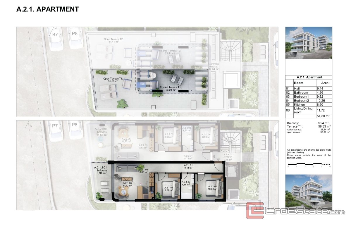 Posebnu vrijednost stanu daje vanjski sadržaj - iz dnevnog boravka izlazi se na balkon od 8,94 m². Ovaj prostor omogućuje uživanje na otvorenom. Dodatan otvoreni prostor čini pripadajuća krovna terasa iznad stana, koja je djelomično i natkrivena i ima površinu od 58,83 m².