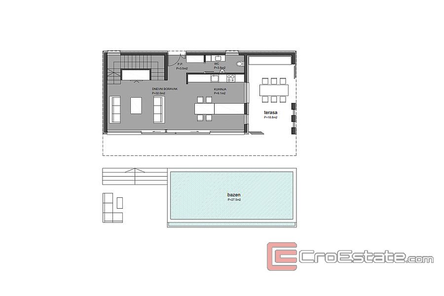 Etaža prizemlja se sastoji od ulaznog hodnika, wc-a, otvorenog koncepta kuhinje i blagovaonice te dnevnog boravka s omogućenim izlazom na vanjsku terasu od 19m2 koja pruža otvoreni pogled na more.