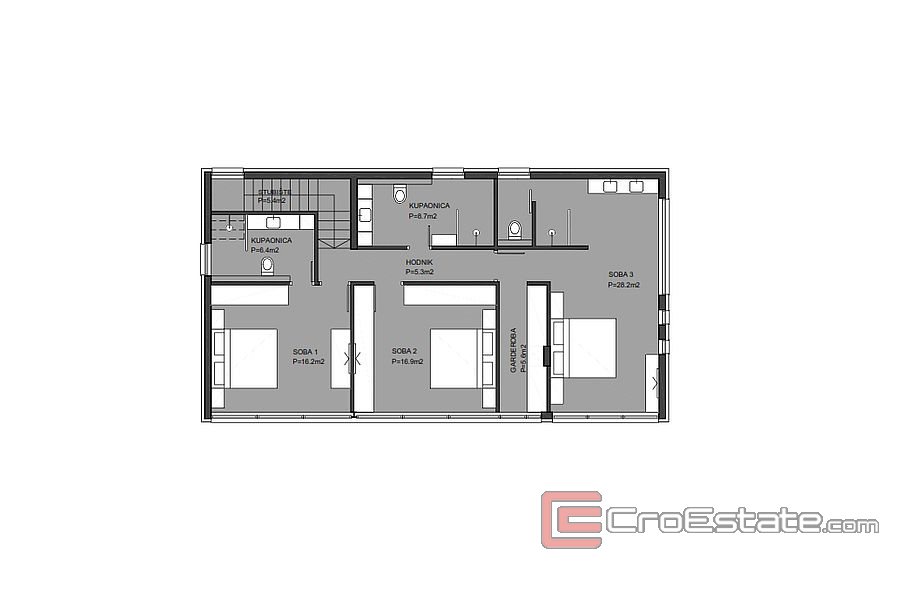 Unutarnje stubište vodi do prvog kata na kojem se nalaze tri spavaće sobe i tri kupaonice.