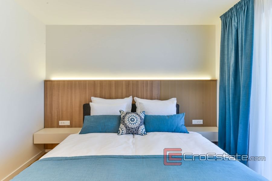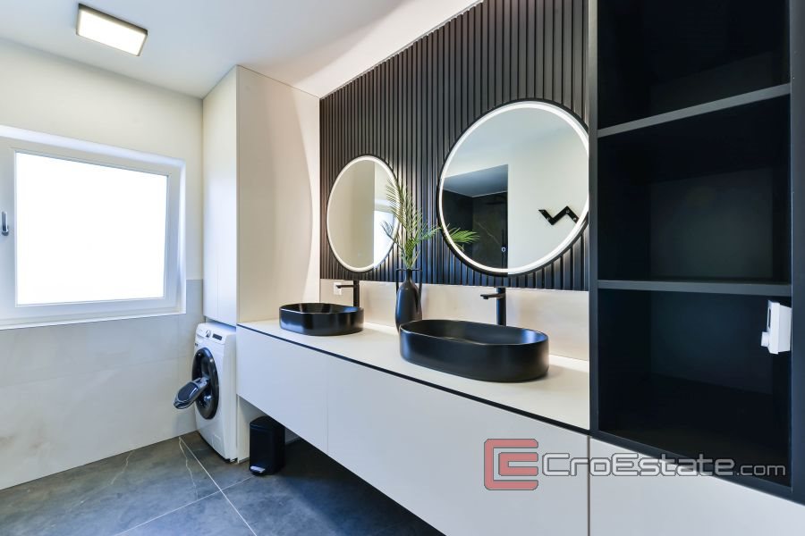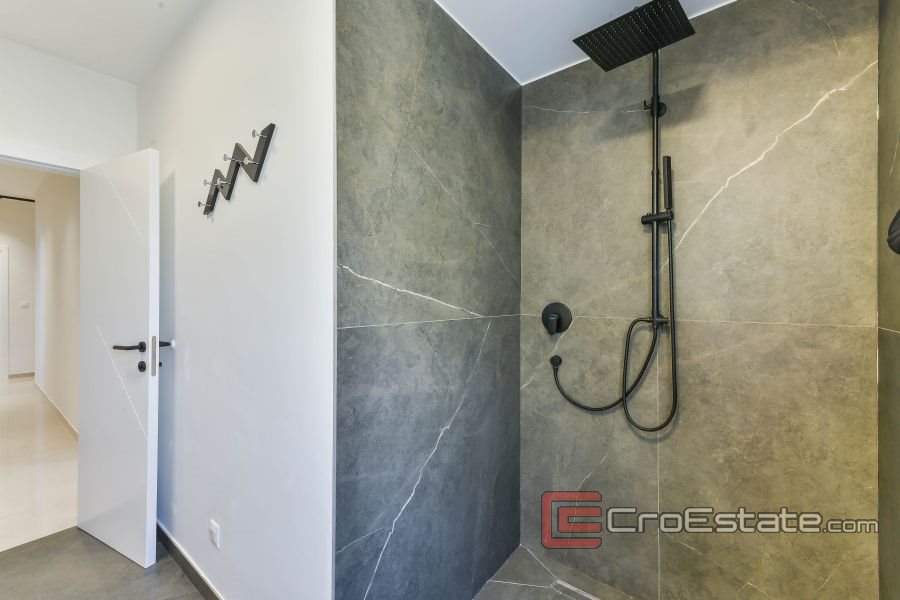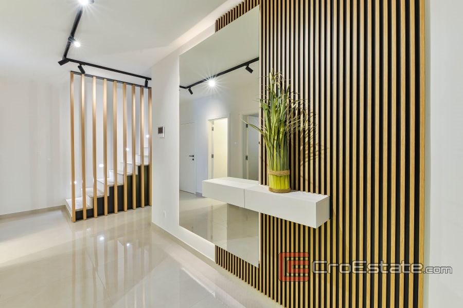 Nekretnina se nalazi u razvijenom i mirnom području. U prizemlju su se nalazi veliki dnevni boravak, kuhinja i blagovaonica. Iz dnevnog boravka se izlazi na terasu ukupne površine 40 m2. Unutarnje skale vode do prvoga kata gdje se nalaze 4 spavaće sobe i dvije kupaonice. Svaka soba ima zasebni klima uređaj. Neke sobe imaj izlaz na veliku terasu od 30 m2. Na 3. katu se nalazi krovna terasa s ljetnom kuhinjom, jacuzzijem i prekrasnim pogledom na more.