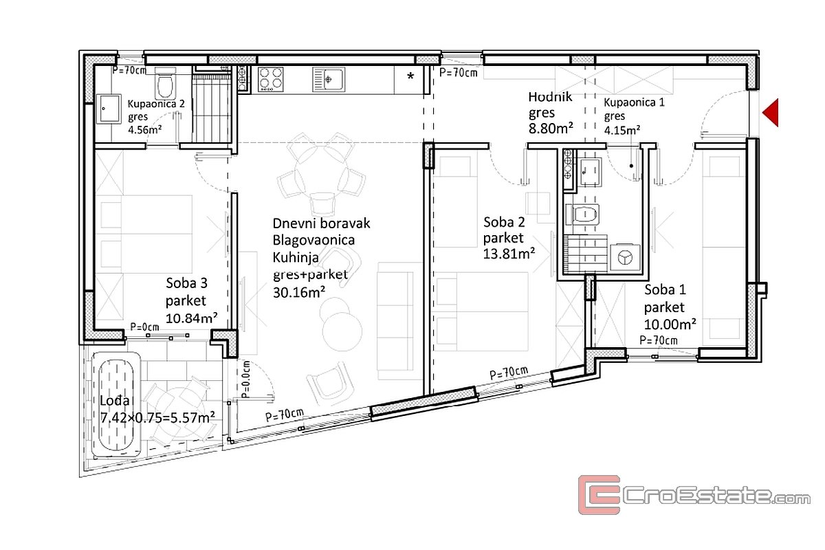 Posebnu ekskluzivnost ovom stanu daje privatna krovna terasa (106 m²), do koje vodi privatno stepenište. Opremljena jacuzzijem, sunčalištem i pergolom, terasa pruža savršen prostor za uživanje i druženje s panoramskim pogledom.