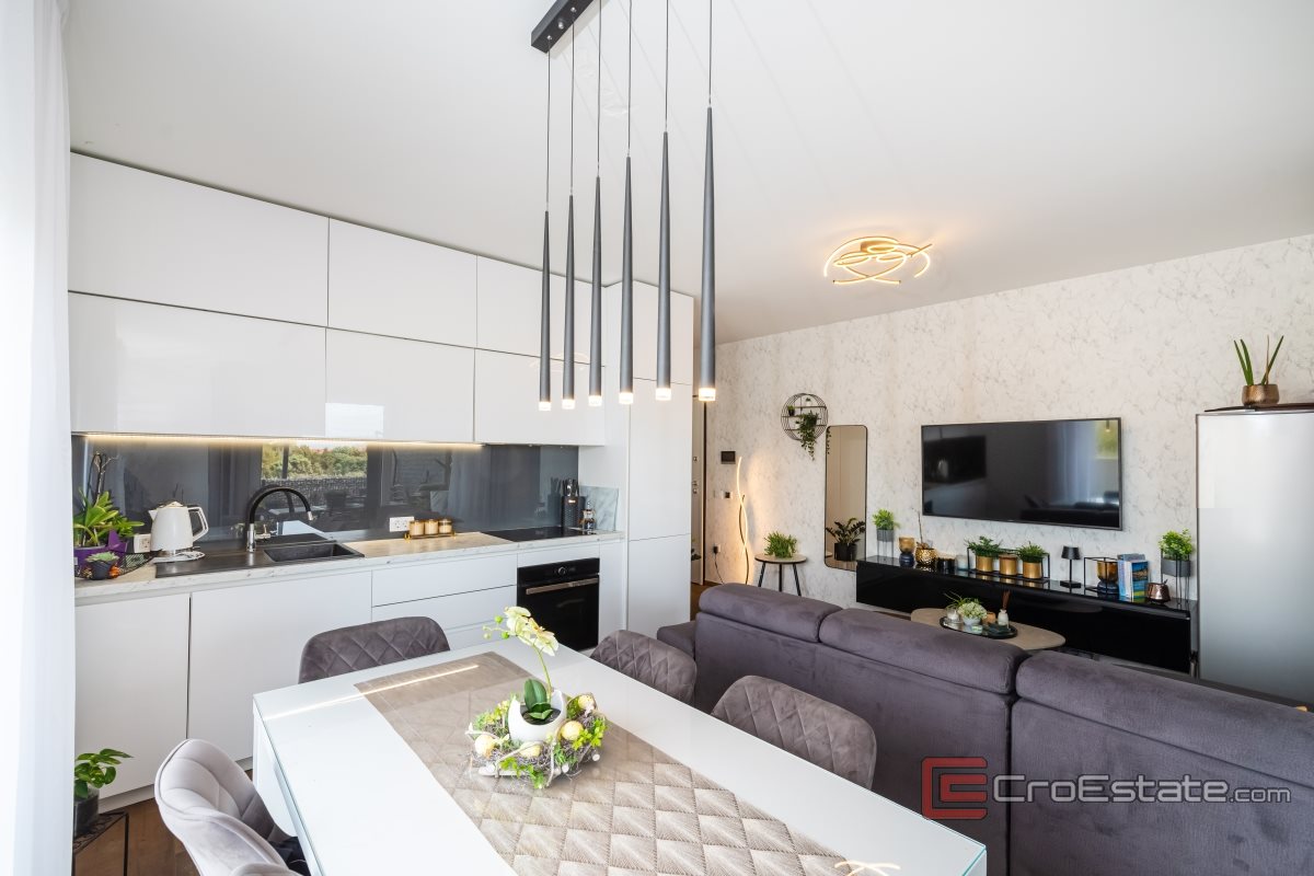 Na prodaju je dvosobni stan korisne stambene površine 56 četvornih metara. Stan se smjestio u prizemlju manje novosagrađene zgrade u blizini Zadra. Sastoji se od dvije spavaće sobe, jedne kupaponice, kuhinje i blagovaonic, te dnevne sobe. Od posebnih pripadaka, stan se ože pohvaliti i s natkrivenom te nenatkrivenom terasom, vanjskim parkirnim mjestom i prostranim vrtom od 100 m2. Ukupna korisna površina stana i posebnih pripadaka iznosi 185 m2.