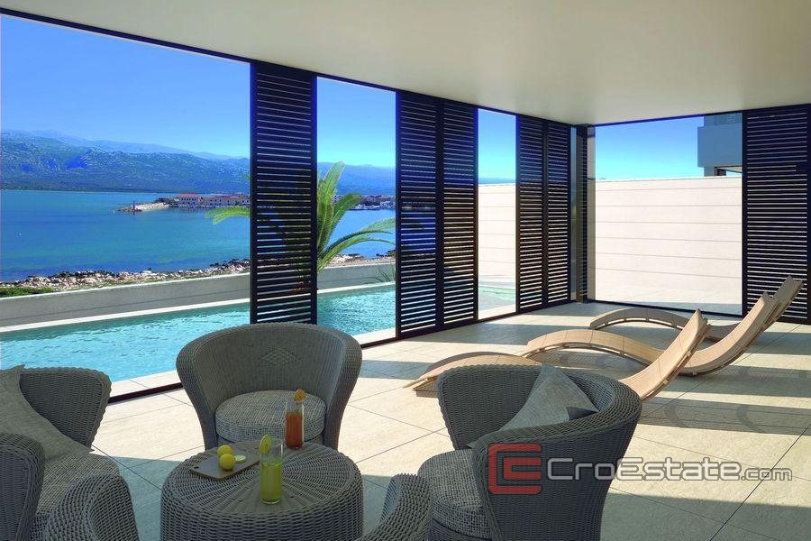Iz dnevnog boravka omogućen je izlaz na natkrivenu terasu južne orijentacije s pogledom na more.Terasa površine 37,87m2 odvojena je staklenim stijenkama i alu roletama.
