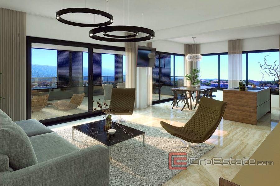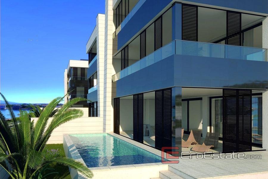 U izgradnji ovog modernog apartmana korištena je fasada debljine 15 cm, kvalitetni materijali poput armiranobetonskih ploča, aluminijskih uloga na balkonima, prirodni brački kamen na fasadama i zidovima, talijanski porculan s efektom zrcala (detalj na fasadama), video nadzor parkiranja s automatskim kliznim vratima, automatska vanjska rasvjeta / LED rasvjeta te dizajn za parkiranje i izravan pristup moru.