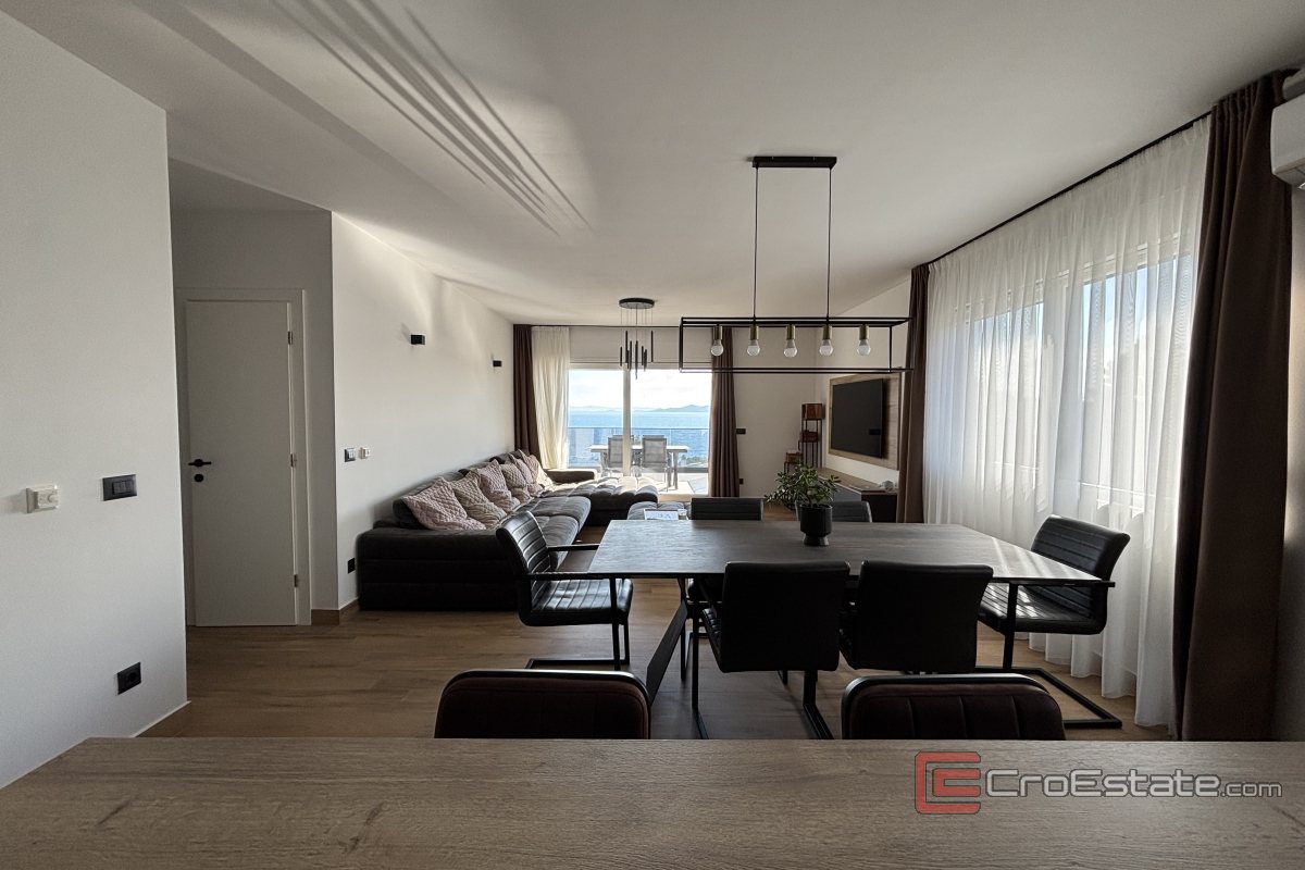 Vi tilbyr en moderne penthouseleilighet med tre soverom og basseng i en ny bygning, som ligger i Okrug Gornji, første rad mot sjøen. Den ligger i andre etasje i en liten boligbygning, i et rolig område omgitt av grøntområder, og tilbyr et høyt nivå av privatliv og en hyggelig middelhavsatmosfære.