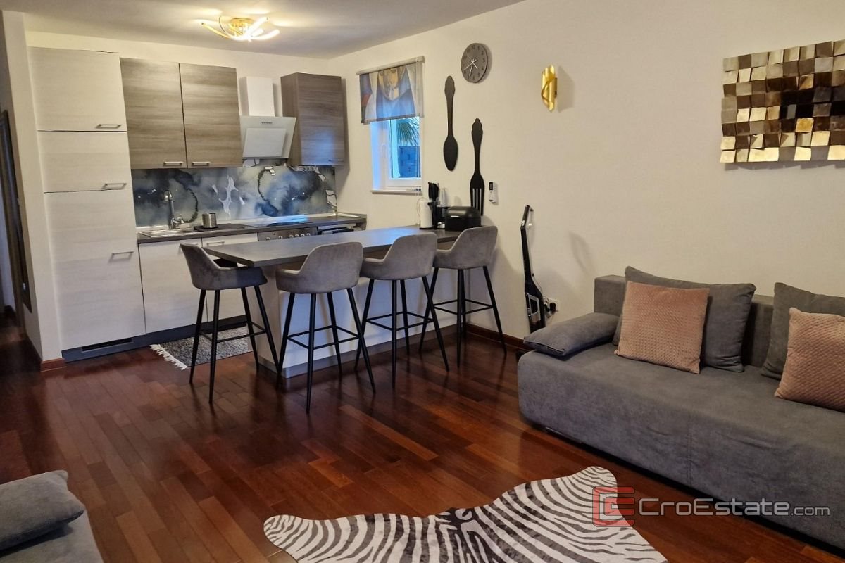 En moderne, moderne leilighet med oppvarmet basseng er til salgs, beliggende i første etasje i et mindre boligbygg med totalt 6 boenheter.