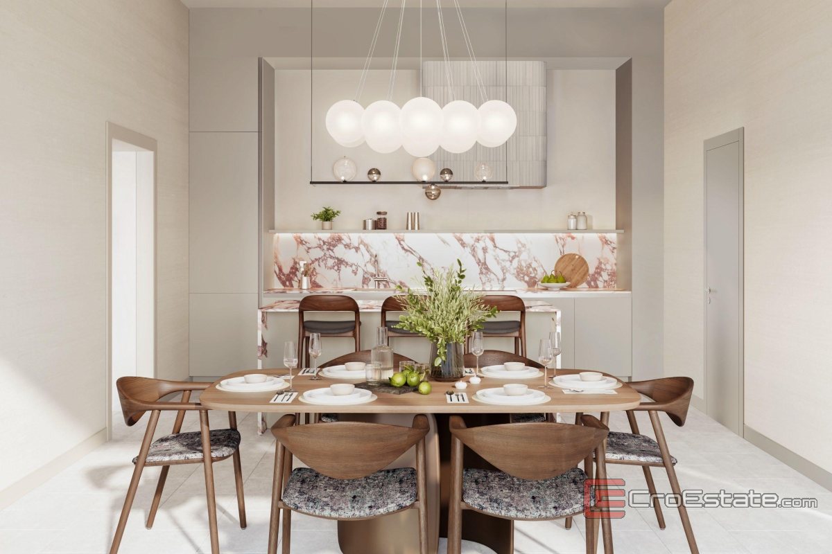 Residensen er designet som en sofistikert kombinasjon av åpen stue og intim privat sone. Den store stuen er forbundet med terrassene gjennom glassvegger i full høyde, noe som skaper en sterk følelse av lys og åpenhet. To soverom med tilhørende bad sikrer det høyeste nivået av komfort og privatliv.