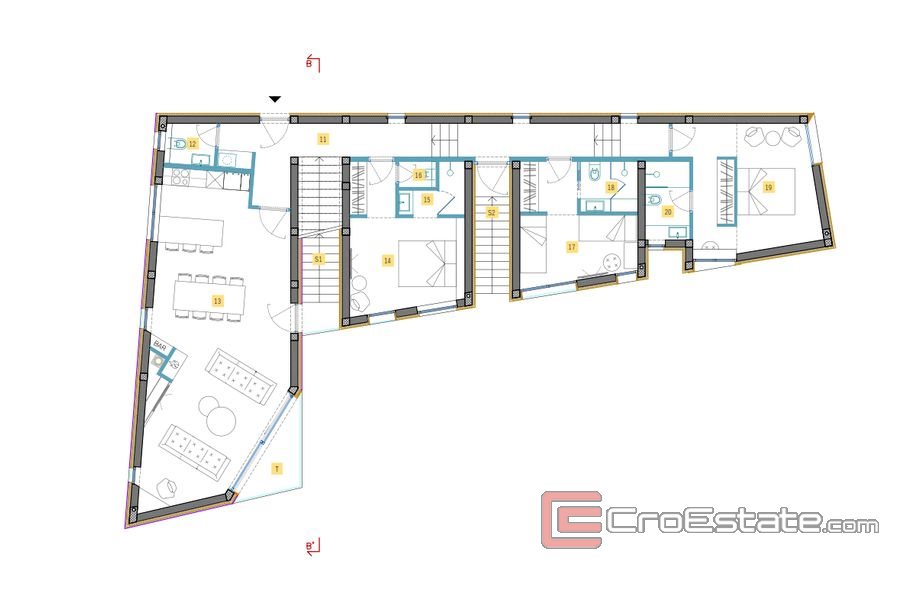 Villaens totale boareal er 245,02 m2 og den er bygget i form av bokstaven L, bestående av en kjeller, en første etasje og en takterrasse.
