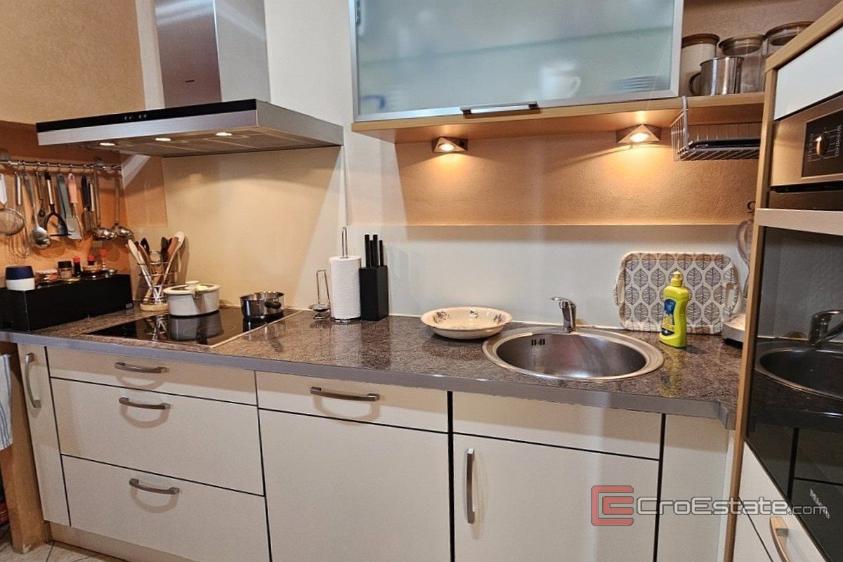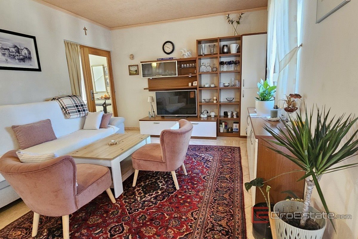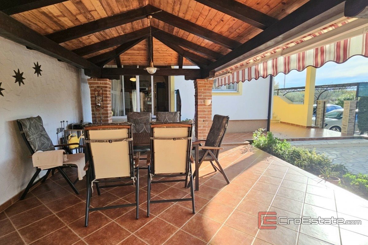 Til salgs er en tomannsbolig med et totalt areal på 158 m², beliggende i et rolig boligområde nær Poreč. Eiendommen består av en første etasje og en øvre etasje, hvor hver etasje er organisert som en separat boenhet. Første etasje inneholder en entré, en gang med bod, et kjøkken med spisestue, en stue, et bad og et soverom. I øverste etasje er det en gang, en stue med tilgang til terrasse, et kjøkken med spisestue, et bad og et soverom. Huset er utstyrt med klimaanlegg for oppvarming og kjøling, mens enheten i første etasje i tillegg har en pelletsovn. Den anlagte hagen inkluderer et overbygd spiseområde, en grill og et hageanlegg. To parkeringsplasser er tilgjengelige. Eiendommen er egnet for ulike formål, inkludert bolig og turistutleie.
