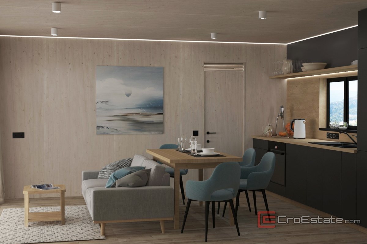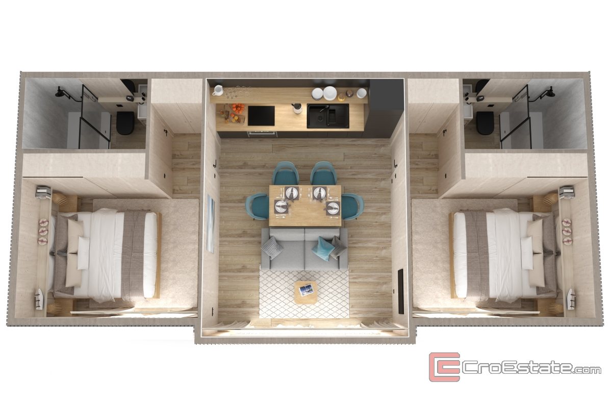 Bobilene dekker 40 m² boareal og består av en romslig stue med kjøkken og spisestue, to moderne soverom, to elegante bad med dusjkabinett og en privat terrasse på 38 m², ideell for avslapning.